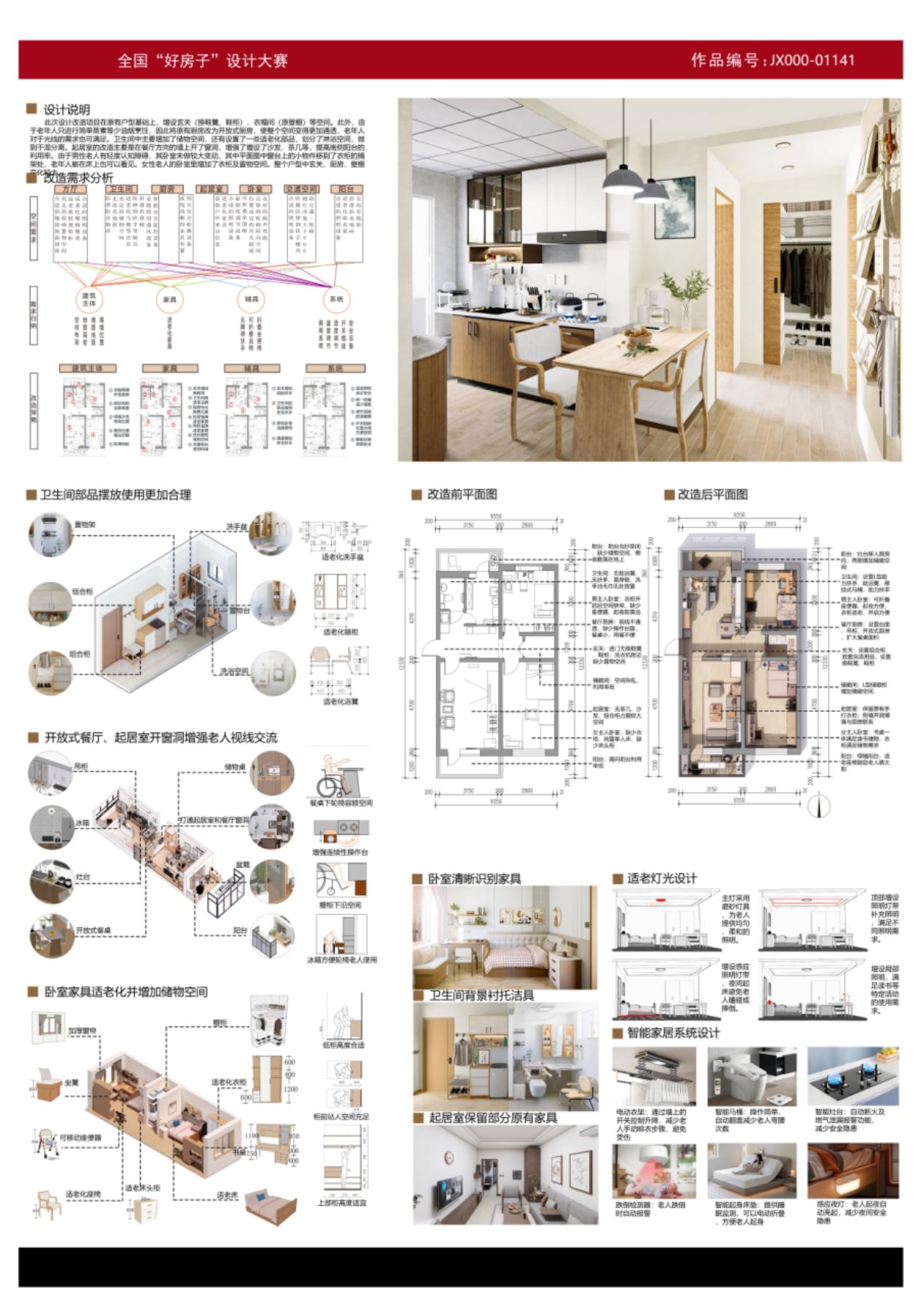 此次为员工选择的参赛户型为老旧住宅中具有代表性的“小方厅”户型,住户为一方有轻度认知症的高龄老年夫妇,住房与住户均具有典型性。方案在尊重原有承重结构的基础上解决了“有限面积条件下不同功能模块的划分与衔接”问题,满足适老化设计要求并符合新时代好房子“安全、舒适、健康、智能”的设计目标。图纸与文字表达系统完整,清晰地传达了设计意图,这也是作品能够获得评委认可的关键。期待更多同学能够保持对建筑设计的热爱,用思考和创意回应时代的课题。