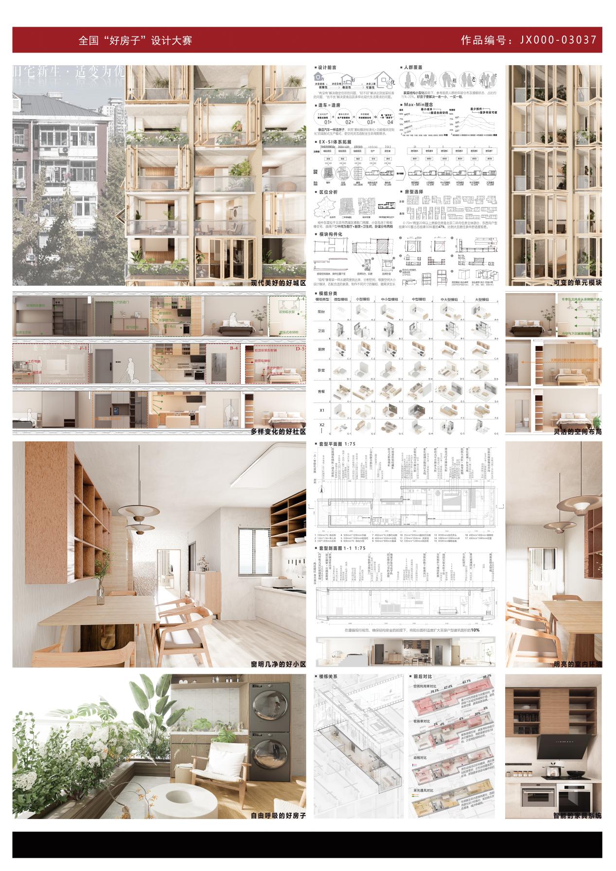 作品聚焦存量更新背景下的既有住宅改造问题,立足普通家庭真实居住需求,回应小户型空间受限与长期使用之间的矛盾。项目突破传统一次性装修与“大拆大改”的更新模式,提出基于既有结构条件的渐进式更新策略,通过规范内空间整合与模块化设计,实现低干预、可持续的住宅优化路径。设计引入并拓展 SI 住宅体系,将住宅中不同使用周期的内容转化为可选择、可替换的功能部件,使空间能够适应家庭结构与生活方式的阶段性变化,降低反复装修带来的经济与资源负担。同时,针对既有住宅采光不足、使用面积受限等普遍问题,在结构安全与规范约束下,通过阳台空间的合理整合与立体利用,显著提升空间效率与居住舒适度。项目以部件化、系统化的更新方式,为存量住宅品质提升提供了具有现实可行性和推广价值的设计范式,体现了面向新时代住房更新的实践探索。