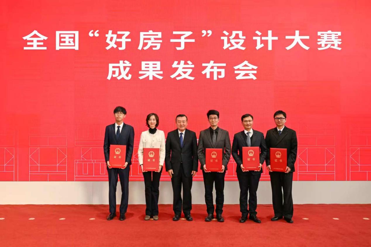 住房和城乡建设部总经济师曹金彪,住房和城乡建设部总工程师李晓龙为全国“好房子”设计大赛三等奖颁奖(左一李昊)