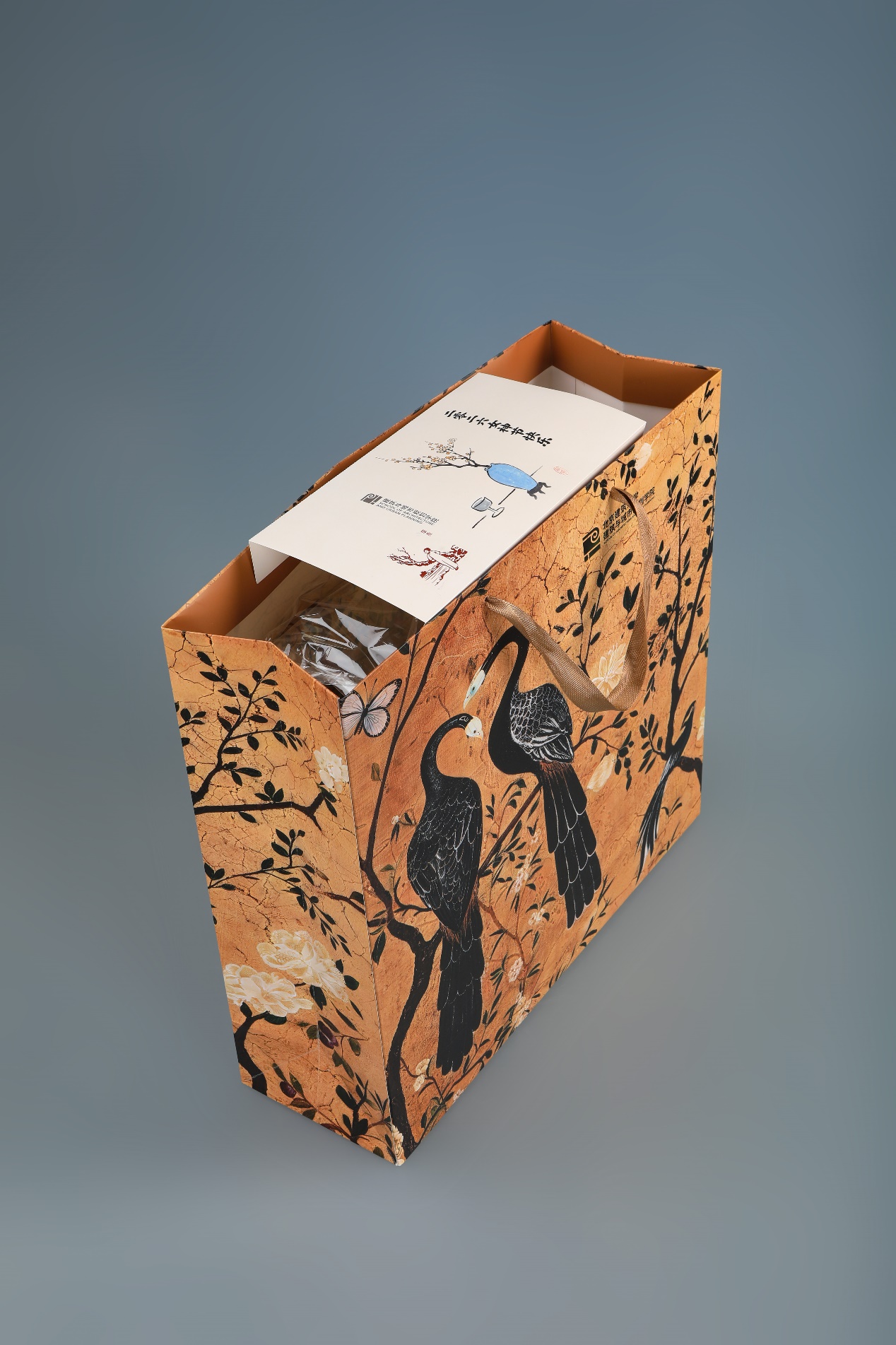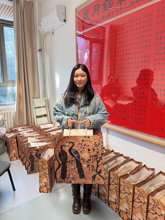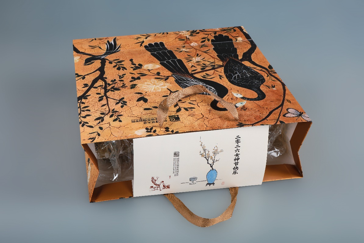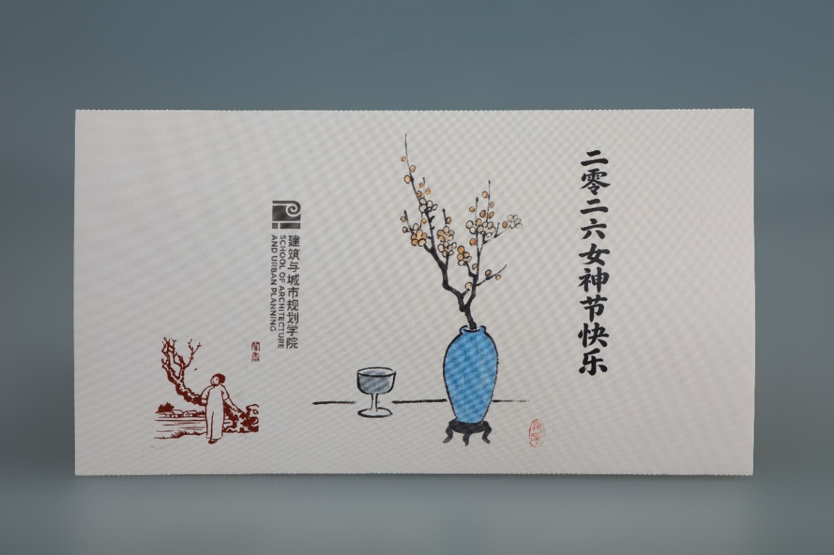 礼物的包装袋图案采用与坐垫、靠腰相同的花鸟纹设计。包装袋封口卡片由公司涂先明老师设计,卡片设计采用了丰子恺的作品作为主要的图形元素。丰子恺是画家、文学家、美术和音乐教育家,他始终关注人性的本真和生活的意趣,作品整体画面简洁,画风朴实,在其传统写意的水墨作品中以书入画,以诗入画,充满着诗意的表达。封口卡片设计中左侧所选的古诗新画作品,远处是乡村、田野,近处是一株梅树,前边站着一位温婉的知识女性,整体透着从容之美;右侧所选的瓶梅与杯酒,则透着一份温柔与诗意。左侧“古诗新画”作品图像辅以小篆字体的“暗香”,由公司杨振老师进行篆刻印章制作。包装封口采用蚂蚁线制作,老师们领取礼物后可以轻松撕下封口卡片留念或作为书签使用。礼物得到了女教师们的喜爱,大家感受到来自公司的一份关怀和温暖。