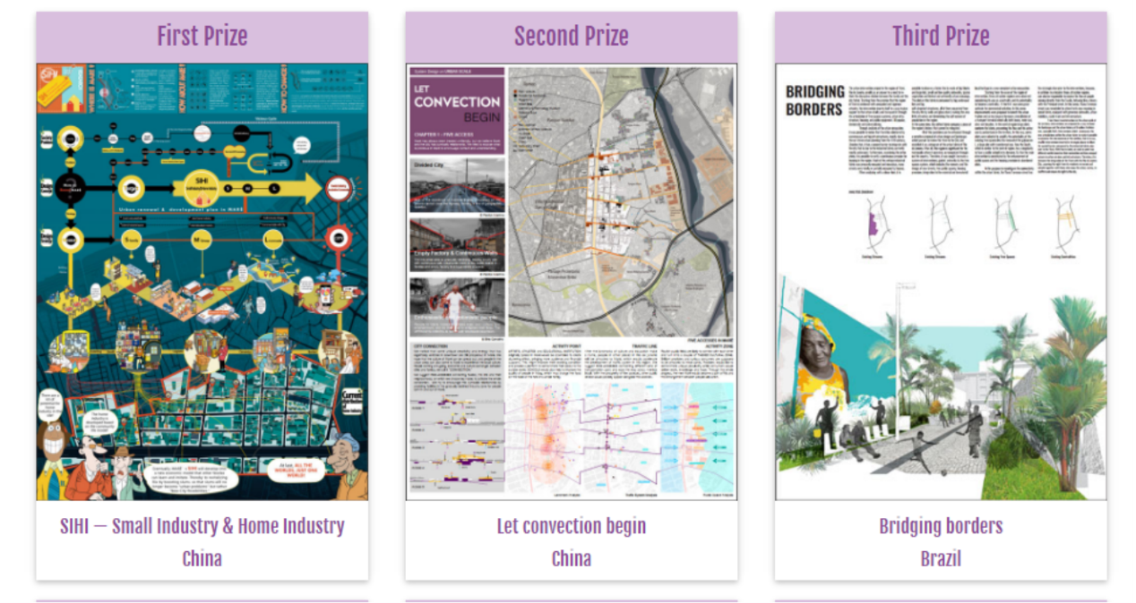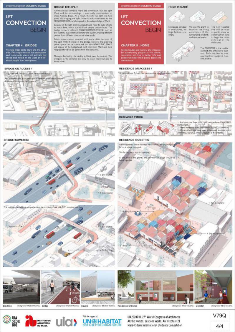 获奖作品选择地块位于巴西里约热内卢的马里——一个正在逐渐衰落的工业区。在这里,已经消失于市中心的具独特创造力和活力的活动,例如街头桑巴舞、实验性说唱音乐和民间比赛仍然繁荣。设计者意图邀请人们体验并传播马里的文化,并以此激发、促进城市繁荣地区和贫民窟间的经济和文化交流,并将其形容为“对流”。在城市尺度上,设计者抓取五条轴线连接贫民窟、设计基地及其周边地区,并在轴线中选择部分关键节点,将工厂改造成文化和教育地标,以激活贯穿城市空间的“对流”。在区域和建筑尺度上,设计者将建筑分为三大类,提出不同的策略,以在教育、交通、公共空间和住房方面提高马里的公共环境和建筑空间质量。