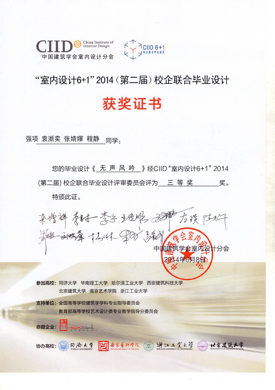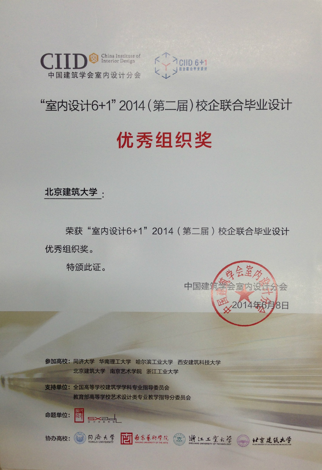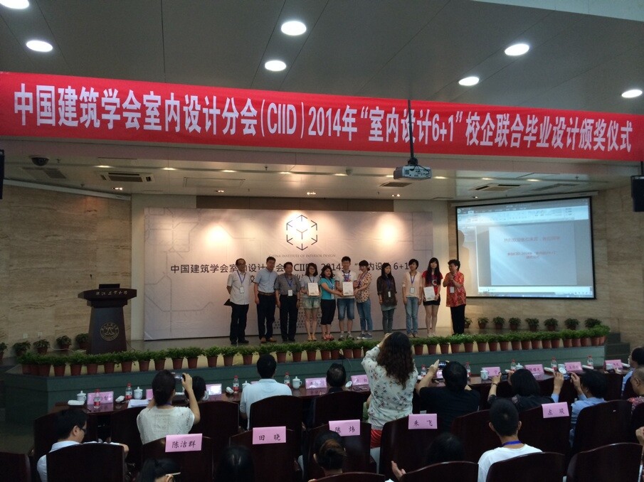 2014年6月8日, 中国建筑学会室内设计分会CIID 2014(第二届)“室内设计6+1”校企联合毕业设计答辩和颁奖活动在浙江工业大学屏峰校园举行,来自同济大学、华南理工大学、哈尔滨工业大学、西安建筑科技大学、十大正规买足球网站、南京艺术公司、浙江工业大学的七所高校,涉及建筑学、环境设计、工业设计和展示设计多个专业的50多位应届毕业班员工共计23组设计方案,经过长达3个多月的思考及创意历程,均在最终答辩及展览中呈现了完整并各具特色的设计作品。专家评委组组长、同济大学来增祥教授为本届活动做了总结与点评。评委会最终评选出一等奖4名,二等奖8名,三等奖11名。