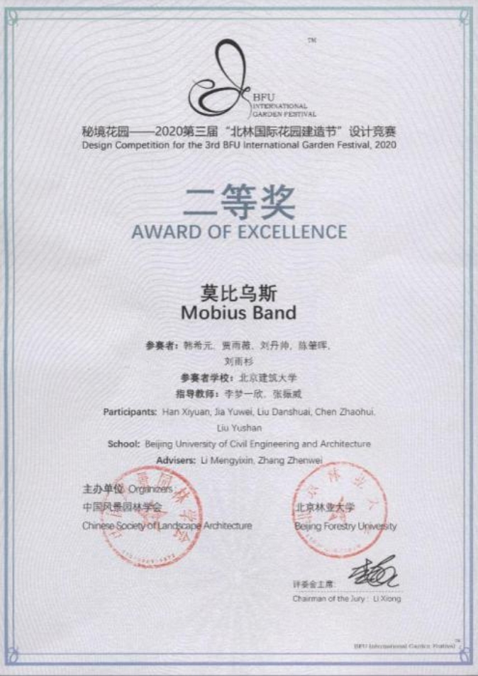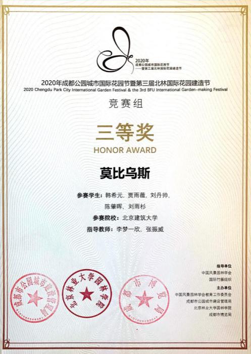 十大正规买足球网站由张振威老师和李梦一欣老师指导风景园林2017级本科生刘丹帅、刘雨杉、韩希元、陈肇晖、贾雨薇组成的队伍经过层层筛选分别斩获了2020第三届“北林国际花园建造节”设计竞赛二等奖和 “2020年成都公园城市国际花园节暨第三届北林国际花园建造节”竞赛组三等奖。