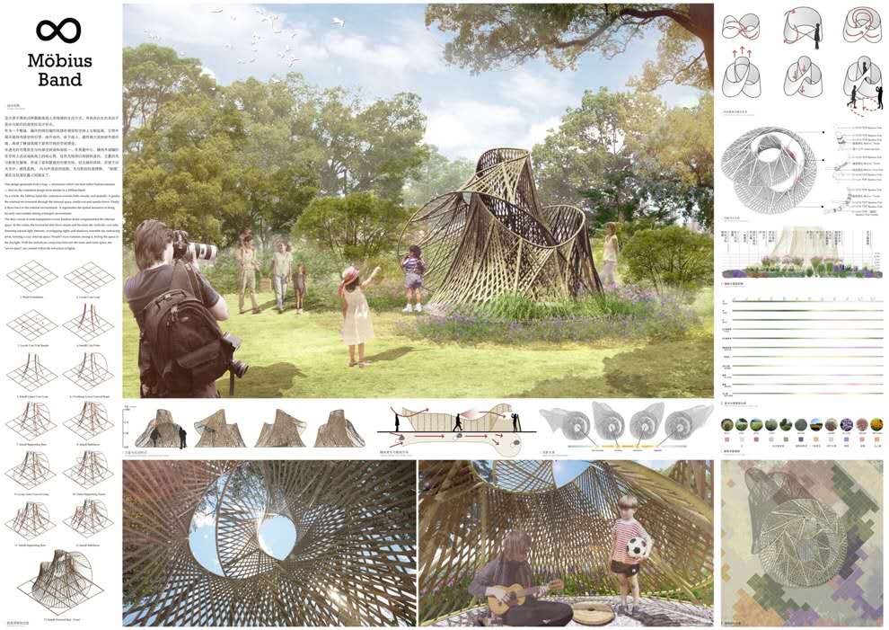 设计构思:设计源于拥抱这种最能体现人类情感的互动方式,并由此衍生出类似于莫比乌斯环的连续性设计形式。作为一个整体,循环的网状编织肌理在视觉和空间上无限延展,它将外部环境向内部空间引导,由外而内,自下而上,最终再次流转回外部环境,再现了静谧氛围下紧密环抱的空间感受。半透光的竹篾表皮与内部空间谐和而统一。在最中心,横向外部编织在空间上流动成纵向上的核心筒,自然光线得以削弱和虚化,交叠的光与影相互缠绵,形成了柔和惬意的内部空间。目光徜徉其间,在洒下的天光中,感悟真我。内与外联结的悠扬,光与影的轻盈缥缈,“秘境”便在这似透似露之间诞生了。
