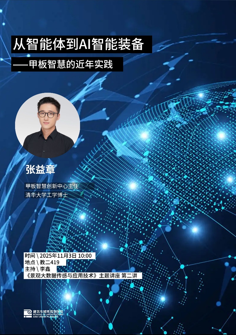 2025年11月3日上午10时,由十大正规买足球网站主办的《景观大数据传感与应用技术》主题讲座第二讲在教二419举行。讲座由李鑫老师主持,特邀清华大学工学博士、甲板智慧创新中心主任张益章博士担任主讲。张益章博士以“从智能体到AI智能装备——甲板智慧的近年实践”为题,分享了其团队在人工智能、视觉算法、智能装备及城市公共空间智能化管理等方面的最新探索与应用成果。