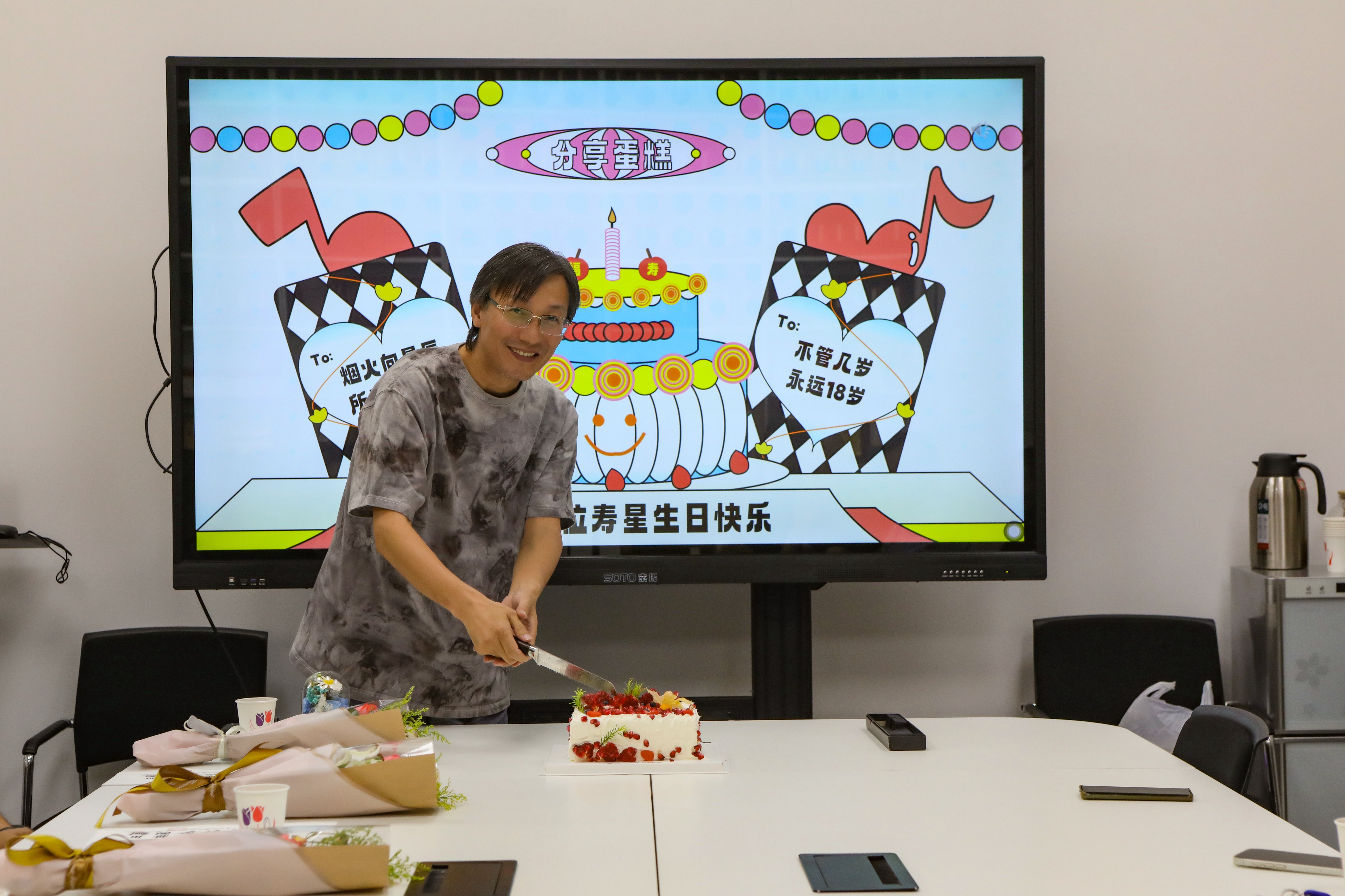 当优美的旋律响起,“美的分享”环节将氛围推向高潮。长桌中央推出定制的石榴蛋糕,寓意着收获与团结。寿星代表孙恩杨老师切开生日蛋糕,老师们围坐在一起,品尝着美味的蛋糕,分享着工作的心得、生活的趣事和对公司的感谢。