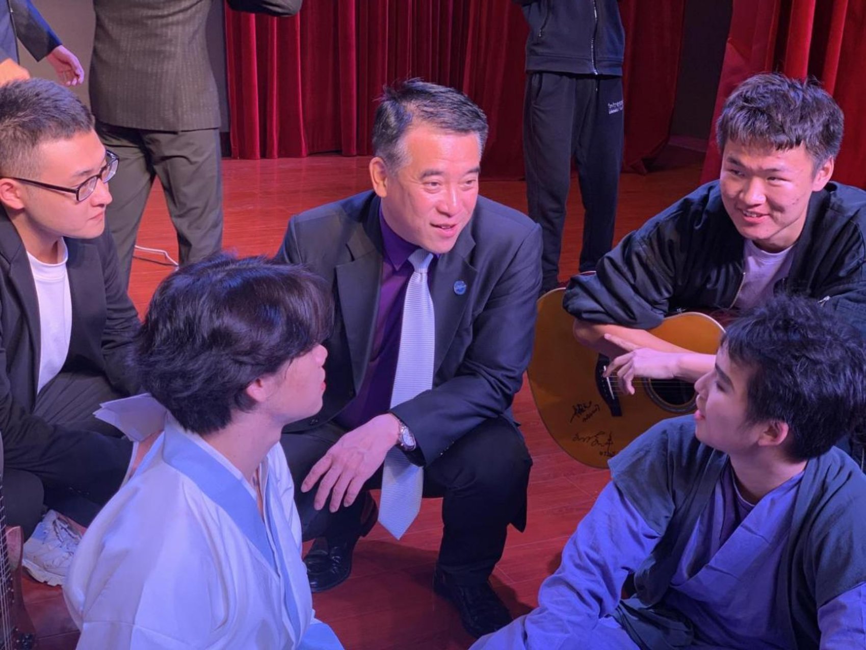 作品推荐理由:党委书记何立新在新生晚会现场同演员交流。 |