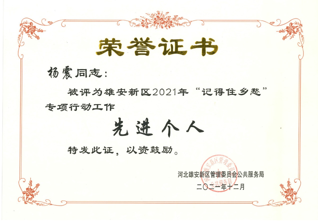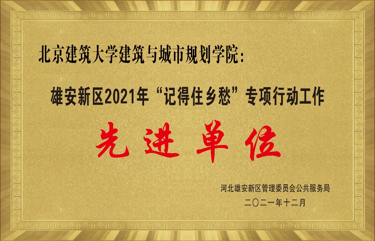 在此过程中,公司马全宝、贺鼎、成慧祯、陈玉龙、杨震、侯晓萱、窦晗天、王阳、刘姿君、刘宏超、王紫琦、程一璞、王冬玉等师生服从大局、勇于担当、甘于奉献,以饱满的热忱、过硬的素质、扎实的工作,冬季冒着寒风,夏季顶着烈日,足迹踏遍新区几百个村落,对各个乡愁遗产点逐一核验评级、动态调整,使之有机融入新区规划建设的方案蓝图,对雄安新区的高质量发展做出了突出贡献,为公司摘取“雄安新区2021年‘记得住乡愁’专项行动工作先进单位”荣誉称号,杨震获评“雄安新区2021年‘记得住乡愁’专项行动工作先进个人”。