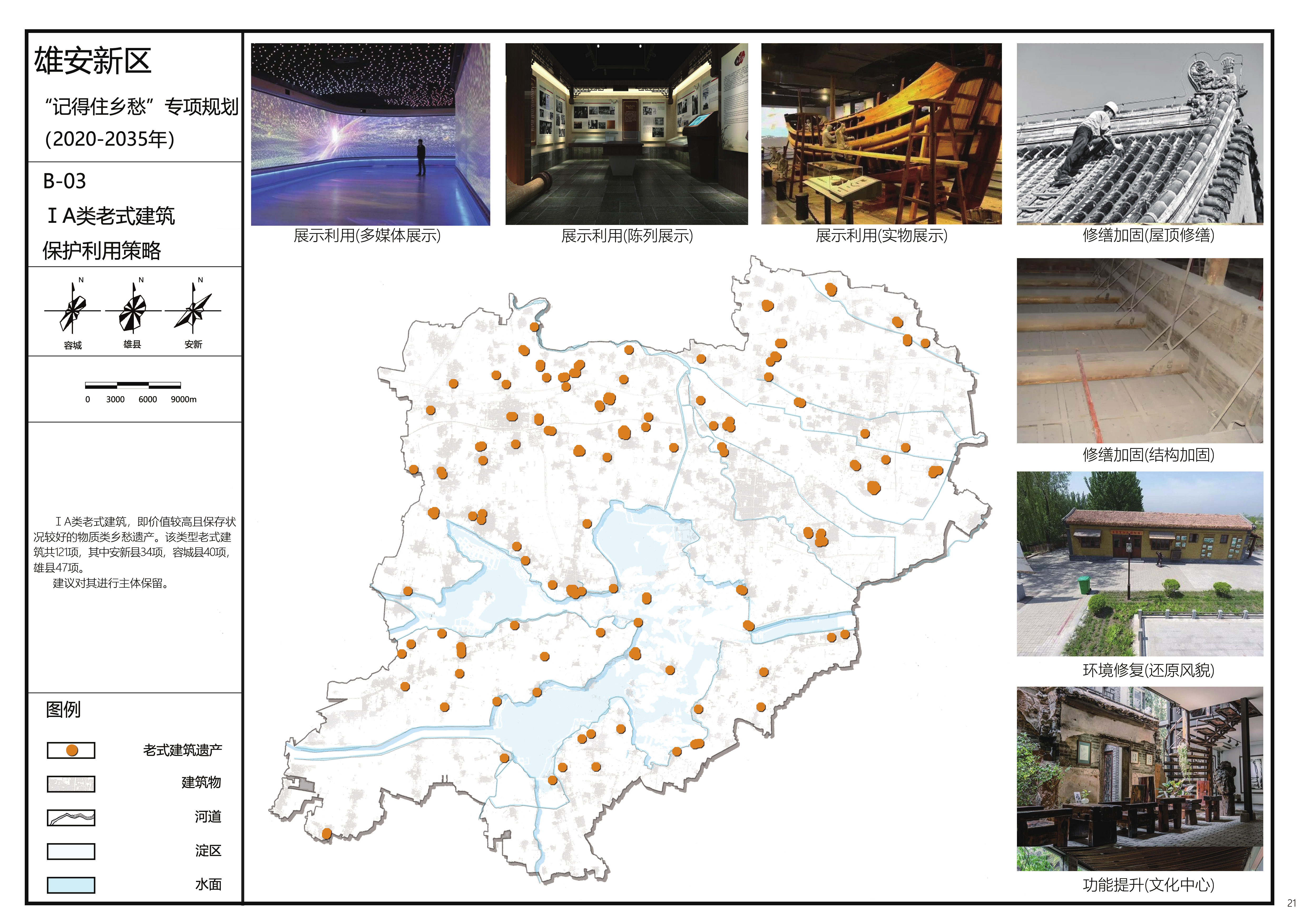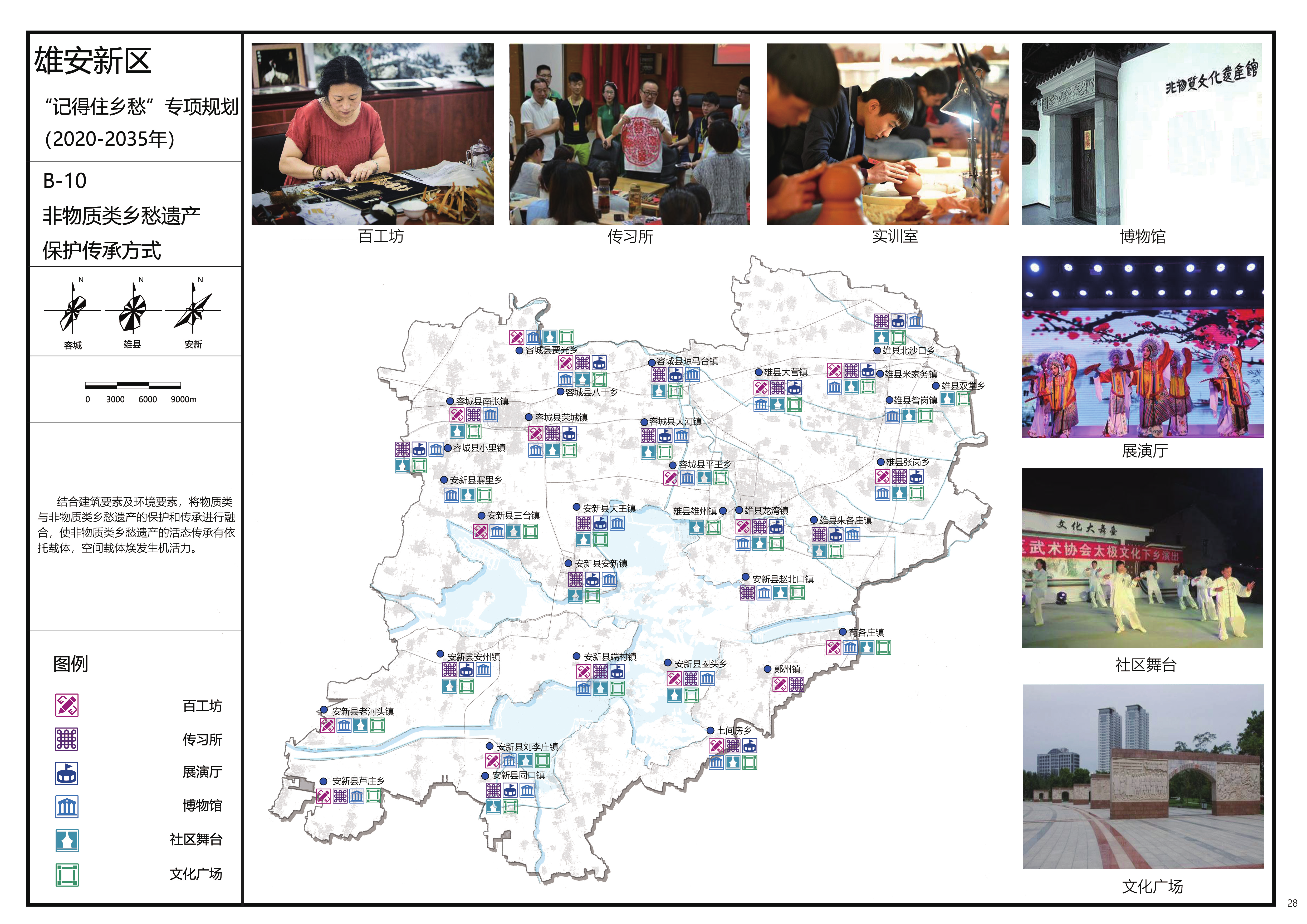 雄安新区“记得住乡愁”专项行动工作,首先是对散布于新区三县大街小巷、田野村舍的几千项乡愁遗产(包括老式建筑、老树名木、遗址墓葬等物质类遗存以及传统美术、传统技艺、传统医药、口头文学、传统音乐、传统舞蹈、传统戏曲、曲艺等非物质类遗存)进行登记造册和评级认定,然后根据不同的等级采取不同的保护、传承和利用策略,例如全部保留或部分保留的物质类乡愁遗产直接纳入新区规划建设的底图之中,成为崭新城市中负载过往记忆的物质载体,“让城市留住记忆,让人们记住乡愁”;构件保留的乡愁遗产集中保管,以做新区本土风格建筑的材料来源;拆除的乡愁遗产也留存影像和文字信息,作为后人追溯历史的素材;非物质类乡愁遗产则结合当地建筑要素与环境要素,建设百工坊、传习所、展演厅、博物馆、社区舞台、文化广场等传承空间。