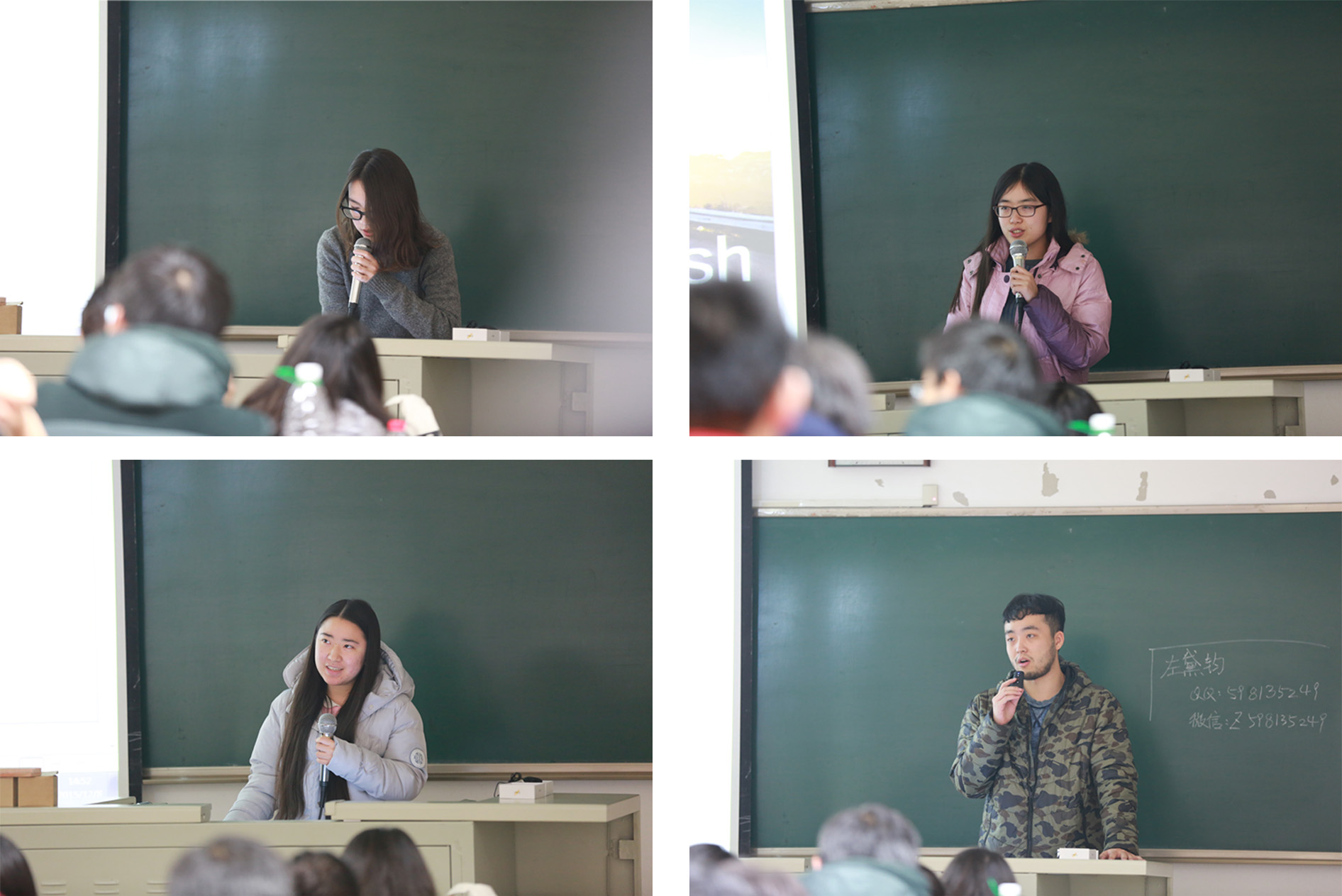 第一位主讲人是规121的王一雅(new sky社长)。她将自己的实习经历与方法介绍相结合,提倡通过语言学习文化。并且她丰富的经历也为我们今后生涯规划提供了多种可能性。随后,建143的王沁雪(new sky副社长)着重分享了自己高中时期的口语学习经验。提出进行疯狂跟读ted演讲和重复电影台词都可以达到很好的效果。来自建131的王晴认为学好英语一定要培养兴趣,对比学习,坚持学习。另外提出了时间安排不合理的现象,建议尽量不要刷夜,不要被建筑专业所带来的情怀蒙蔽。建122的左黛钧则侧重分享时间管理方法。学姐现场还展示了她平日记满单词的笔记活页,其用功程度可见一斑。此时讲座时间已然过半,大家都有些困倦,然而左学姐时而幽默的调侃与自嘲的语气逗得大家频频笑场,使得氛围轻松许多。接下来毕业班的刘天舒分享给我们她锻炼语感的方式----大声读,而对于背单词则要从英语文章中找到高频词汇并记忆。来自建111任未乙先分析建筑市场趋势,说明英语会是以后求职过程中的分水岭。同时运用雅思中的真题进行讲解。最后建143的董子杨(new sky副社长)就如何应对四六级分享了自己的经验,得以让学弟学妹自如应对临近的四六级考试。