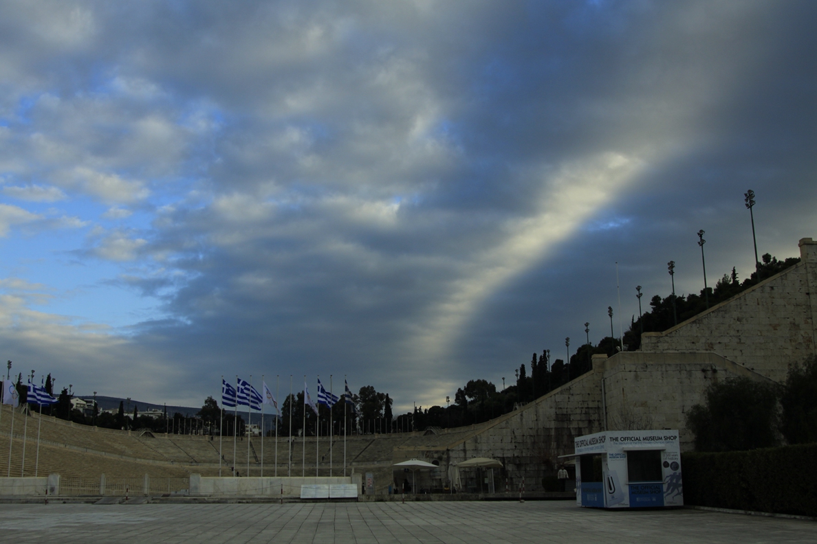 在离卫城不远处有一座著名的体育场,即帕纳辛纳科体育场,又名古大理石体育场,1896年第一届现代奥运会就在此举办。古希腊时期,这里经常举办泛雅典运动会,以此来纪念雅典娜女神。如今的体育场建于1895年,整座体育场呈“U”型设计,三面均为观众席,材质全部为大理石,半圆两侧的观众席长达百米,数十层高的观众席进一步渲染了体育场的宏大,真正身处其中时,似乎依稀可以想象到4万余名观众欢呼的场景。经过一百余年的风雨洗礼,体育场的型制基本保持了原有的风貌,依旧使用黄土地作为比赛跑道,观众席仍没有安置护栏,整条的大理石作为座椅。
