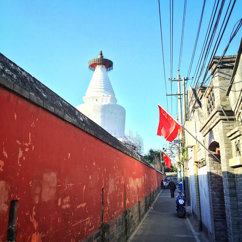 原来有一部在北京台播的纪录片,叫《北京记忆》。这部片子里就出现了下面这张照片的位置。其实阜成门这边,是我上大学之后才常来的,毕竟公司就在西直门,没事的时候骑着车就溜达到白塔寺了。一直到现在我都在思考,生活在白塔寺下面的人,和我们这群生活在鼓楼周围的人,性格会不会有很大的差异呢?我觉得建筑带给人性格上的影响是有可能的。