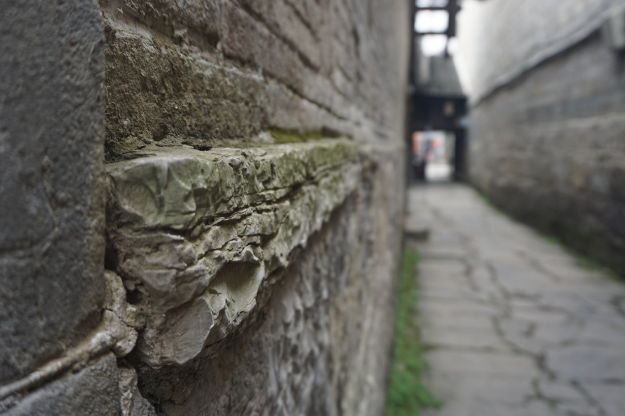 这是老街唯一原滋原味保留下来且可供外人参观的老巷子了,它便是陈家巷,从古至今这条巷子都住着姓陈的人,想象一下,也许最开始的时候都是陈姓家族在此居住,多年以后这个巷子里的人们血缘虽已疏远,但是陈姓的人门却因这个巷子的名字被一种神奇的力量牵在了一起,是否觉得神奇?我把它称作石巷,石头铺地,石头筑墙。杂草从石缝里钻出来,石墙上也长满了青苔,满是岁月的痕迹,但却在经过时间的沉淀后具有它独特的韵味,手指抚摸石墙,感受它要告诉我的故事。一到下雨的时候,我就会想起戴望舒笔下的《雨巷》,想象着,有一位撑着油纸伞,如丁香一样的姑娘,在烟雨朦胧中缓缓从远方走来,这条石巷完全我心中对《雨巷》的想象啊!