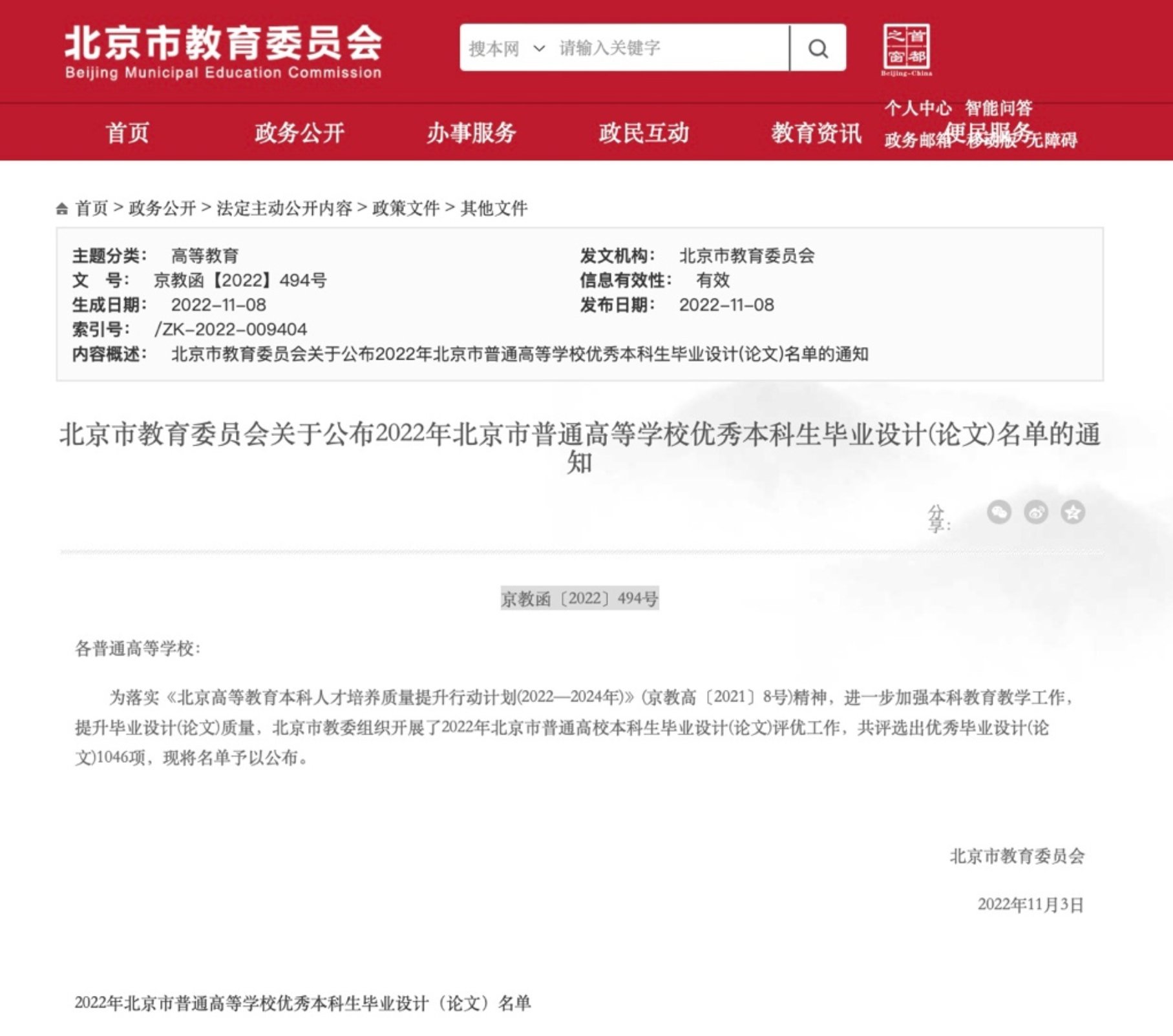 根据北京市教育委员会关于公布2022年北京市普通高等公司优秀本科生毕业设计(论文)名单的通知(京教函〔2022〕494号),公司十大正规买足球网站荣获得两项优秀毕业设计大奖。