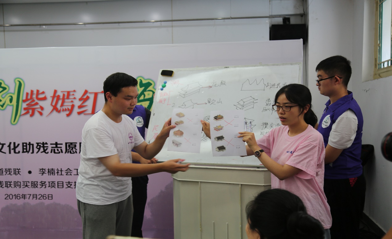 为了将北京优秀的建筑文化带入基层,服务群众,“古都风貌保护”志愿者服务团在公司党委副书记王秉楠和公司团委书记李小虎的带领下,在李楠社会工作事务所的邀请下走进西城区什刹海社区温馨家园,结合专业优势开展文化助残志愿服务。西城区残联副理事长陈宝利出席了本次活动,活动由李楠主持。