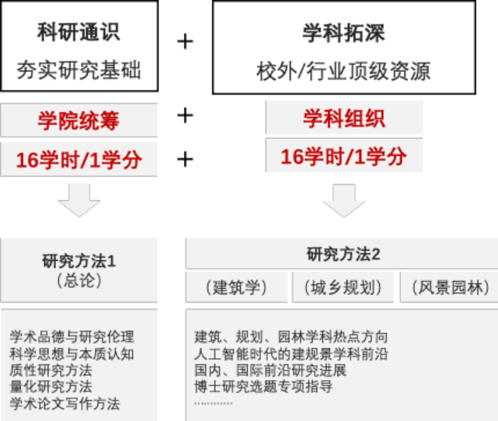 《研究方法》采用“科研通识+学科拓深”方式组织课程,其中《研究方法1(总论)》课程由公司整体建设,建筑学、城乡规划学、风景园林三个学科的博士共同修读,课程旨在夯实研究基础,包含学术品德与研究伦理、科学思想认知、质性 / 量化研究方法、学术论文写作等总论内容。之后分团队建设《研究方法2(建筑学)》《研究方法2(城乡规划学)》《研究方法2(风景园林)》3门课程,分别针对三个学科专业背景的博士生,充分链接校外及行业顶级资源,围绕学科热点、人工智能时代前沿、国内外研究进展及博士选题等方向开展专项指导。