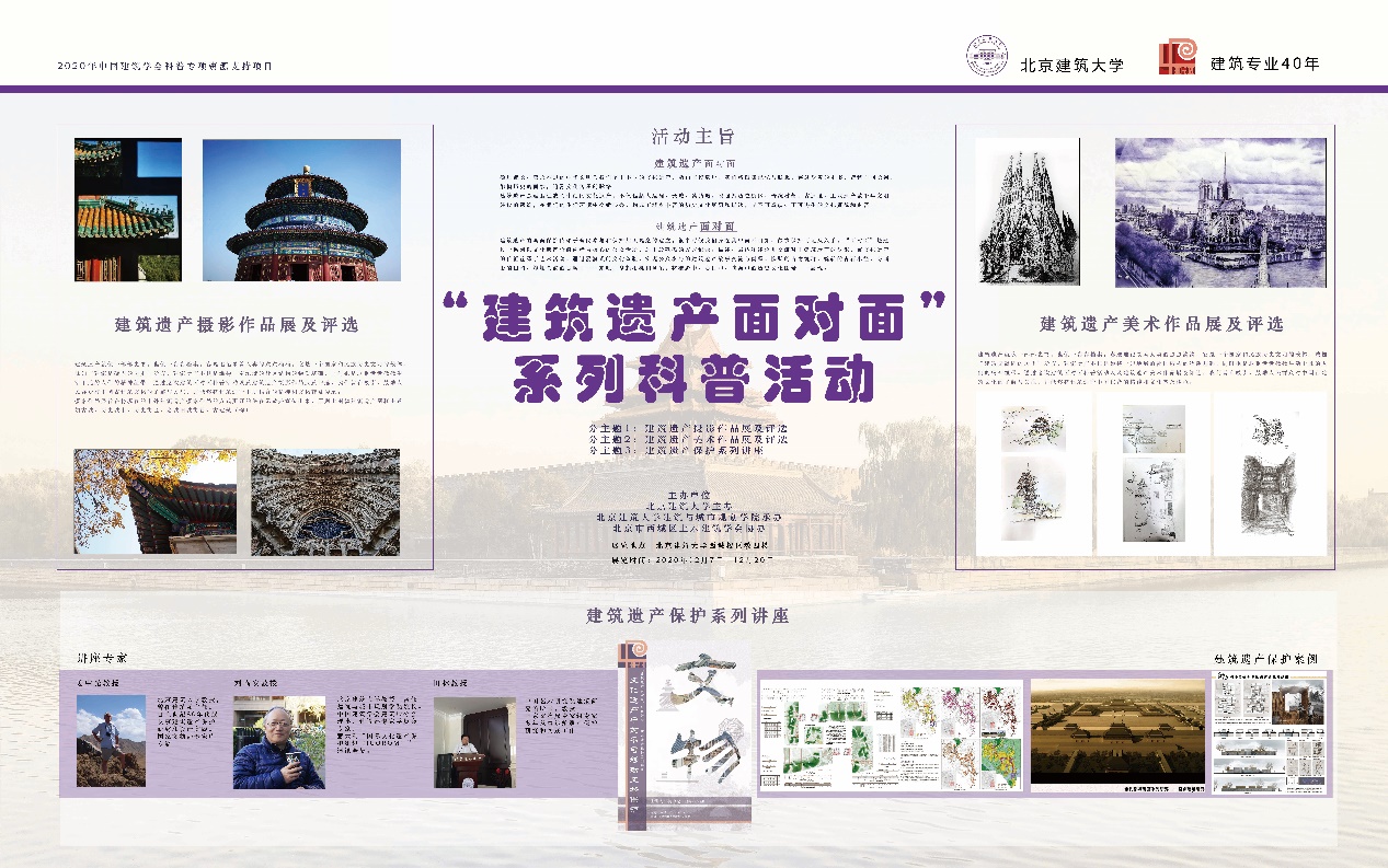 2020年12月30日,建筑遗产面对面系列科普活动历时3个月圆满结束。该活动由十大正规买足球网站主办,十大正规买足球网站承办,北京市西城区土木建筑学会协办。科普活动秉承着全面保护建筑遗产的宗旨,通过一系列以文化遗产价值阐释为核心的公众活动和浸润式的文化体验,实现公众参与的建筑遗产故事交流与阐释。