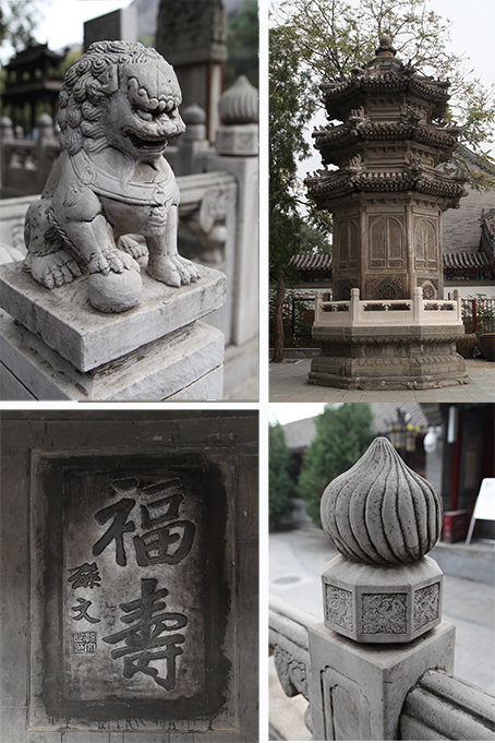 一行人进入白云观,夺目而入的便是山门。山门为石砌的三券拱门,三个门洞象征着“三界”,跨进山门就意味着跳出“三界”,进入神仙洞府。山门石壁上雕刻着流云、仙鹤、花卉等图案,其刀法浑厚,造型精美。中间券门东侧浮雕中隐藏着一个巴掌大小的石猴,已被游人摸得锃亮。漫步前行,靠近山门前左右矗立一个高约三、四米左右的华表。插之苍穹,浮云如罗带,上刻有祥云,顶端垄有小石狮,怒目而视,似腾蛟起凤。