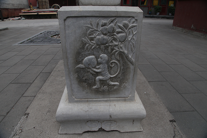 领略过八仙风采,在白云观左廊的尽头有处十二生肖墙,它兴建于一九九三年。十二生肖是产生于我国本土的一种古老文化,是中华文化源远流长的典型代表之一。鼠咬天开智取第一,牛辟田地勤耕丰年,虎为山王驱邪避灾,兔玉奔月喜庆吉祥,龙腾云雾升天入渊,蛇称小龙灵活机谨,马到成功前程万里,羊致和贵亲善和睦,猴王神通自由自在,鸡鸣报晓旭日东升,狗亦图腾守信尽职。各种动物雕刻精细,栩栩如生,每种属相也都有其吉祥之意。在十二生肖墙前,星座学说恍然间黯然失色,唯有那一个个富有灵性的动物才最能体现出古代人们对于生辰的解读。年岁轮转中,生肖司春生夏长,秋收冬获,掌日出扶桑,日落猿啼,在时光中为每一次秒针转移都赋上期盼与美满。