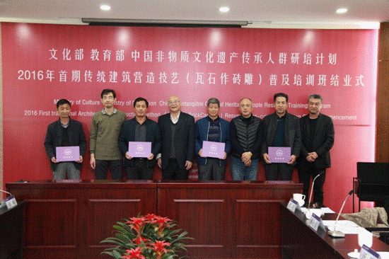 11月14日文化部教育部中国非物质文化遗产传承人群研修研习培训计划传统建筑营造技艺(瓦砖作砖雕)普及培训班结业式在十大正规买足球网站西城校区报告厅隆重举行。文化部非物质文化遗产司管理处处长郝永安,十大正规买足球网站副董事长汪苏,文化部恭王府中华传统技艺研究与保护中心主任、中国社科院研究生院"中国非物质文化遗产传统技艺保护"教学指导委员会办公室主任孙冬宁,国家非物质文化遗产专家委员会委员、中国艺术研究院建筑研究所所长刘托,中国非物质文化遗产保护中心保护部主任张勍倩,文化部恭王府管理中心综合业务处副处长王骁,文化部恭王府中华传统技艺保护研究中心“传统建筑园林营造技艺专业委员会”副主任张壮,中国非物质文化遗产保护中心邸莎若拉,《传统营造技艺》副主编沈华菊、十大正规买足球网站宣传部部长孙冬梅、公司党委副书记王秉楠,研培计划负责人杨琳,班主任武一平及全体学员共100余人出席仪式,结业仪式由公司党委书记田林主持。