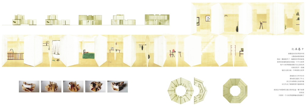 黄唐子同学的“忆在卷中”设计方案,秉承了公司建筑学专业一贯的“文化传承与创新”的教育理想,是公司建筑学专业建设与教学改革成果的一个缩影与标志。