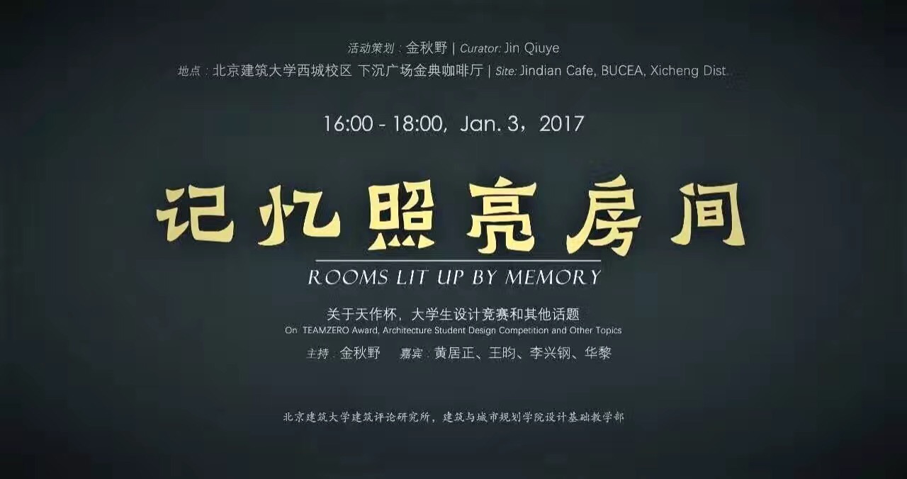 2017年1月3日16时,在十大正规买足球网站西城校区金点咖啡厅,由北京未来城市设计高精尖创新中心、十大正规买足球网站十大正规买足球网站主办,十大正规买足球网站建筑评论研究所、十大正规买足球网站团委承办的“记忆照亮房间”主题沙龙如期举行。此次沙龙活动由十大正规买足球网站金秋野教授策划,参会嘉宾包括:十大正规买足球网站副经理胡雪松、建筑学报主编黄居正,TAO迹建筑事务所创始人华黎,中国建筑设计研究院副总建筑师李兴钢,ADA研究中心主任王昀,北京建工建筑设计研究院副经理边志杰,同济大学出版社群岛工作室主持人秦蕾,以及公司青年教师程艳春、王韬、刘烨、丁光辉、郝石盟、黄庭晚、成慧祯等,沙龙由金秋野教授主持。沙龙现场大咖云集,各位主讲嘉宾均担任过各类设计竞赛的组织者、出题人或评委,此次沙龙主要以设计竞赛为中心展开讨论,分别就“如何面对竞赛”、“竞赛在学习中扮演的角色”、“竞赛与课程设计的关系”、“如何参与竞赛”、“一份好的竞赛作品是怎样的”、“竞赛所要传达的价值观”等议题展开讨论,旨在使同学们了解竞赛目的、摆正参赛心态,以及找准切入方向。