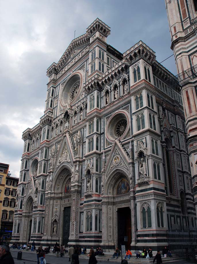 如果说新圣母教堂让艾吉奥感动于其的简洁而精巧的美感,那么花之圣母大教堂就让我知道并叹服于艺术的秩序美。是的,于我而言它就是一个艺术品,一个需要175年时间养育的孩子,一个可以精致美丽到匪夷所思的地步。它美,美在各处优雅壁画装饰,美在“鱼刺式”的结构架式,从下往上逐次砌成,美在能使用鼓座,全部表现出来阳光下穹顶的圣洁。同时也成为整个城市轮廓线的中心,也是城市的灵魂栖息地。怪不得百年之后,米开朗基罗在罗马圣彼得大教堂也建了一座类似的大圆顶,却自叹不如:“我可以建一个比它大的圆顶,却不可能比它的美。”我在佛罗伦萨所见过的庄严雄伟的教堂很多,但从未见过教堂能如此妩媚。这座使用白、红、绿三色花岗岩贴面的美丽教堂并不庄严古板,反而是…古典、优雅、自由,我想见到它的人体会的不是天主的威严,而是母性的光辉,难怪会被命名为“花之圣母”。