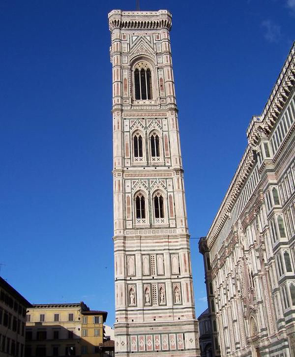 我突然惊住了,为艾吉奥所攀的建筑。在我眼前,仿佛拔地而起的乔托钟塔将阳光一分为二,旁边有只鹰远远地悬着。外观是一个四角形的柱状塔楼,把粉红、浓绿和奶油三种颜色,以几何学的配色方式调合,再往上看,给我最大的感受在于规则的严整,可以说一层一层的交替中,丝毫不觉得违和,反而有一种别样且令我震撼的秩序美。