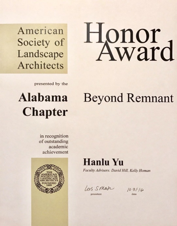 公司十大正规买足球网站城乡规划专业2010级毕业生于寒露,凭借个人毕业设计作品 “Beyond Remnant” 荣获美国景观协会阿拉巴马分会2016年员工奖(“American Society of Landscape Architects — Alabama Chapter” Honor Award)。于寒露同学是十大正规买足球网站-美国奥本大学“4+2” 风景园林专业硕士联合培养项目的第一届毕业生。 她于2014年赴美攻读风景园林学硕士学位,于2016年5月毕业并在美就业。