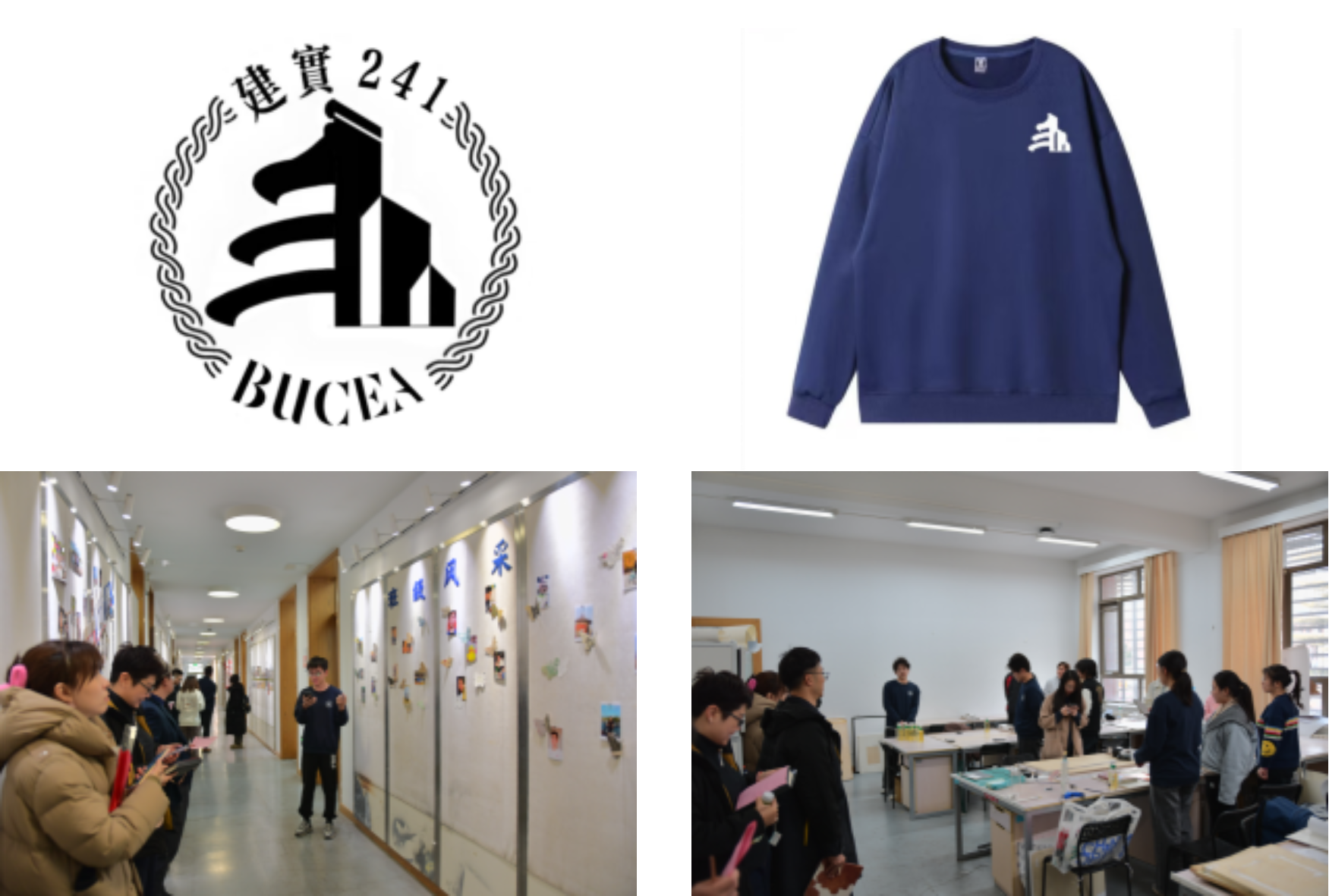 建实241以古今融汇为主题,因此班徽采取由古建祈年殿和现代摩天大楼将其抽象为剪影制成,象征着古代建筑与现代建筑的融合,寓意我们在未来学习建筑知识的路途上,贯通古今,融合中西。专教展示墙展列出班级同学与班主任的照片,象征班级体的凝聚力。班服以藏蓝色为主色调,寓意在学习与设计的路途要保持谦虚稳健的心态,同时兼具耐脏的实用性。建实241是怀揣着虔诚之心的学子,在浩瀚的建筑海洋中乘风破浪不断探索。