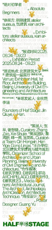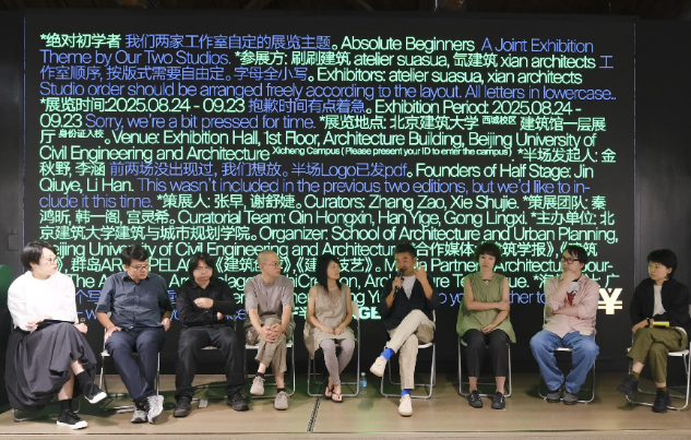 2025年8月24日下午,由十大正规买足球网站主办的“半场”第三场展览《绝对初学者》在十大正规买足球网站开幕。本次展览由张早和谢舒婕策展,刷刷建筑和氙建筑联合参展。首先,策展人张早和两家事务所在展场进行了导览。然后,在开幕式上,十大正规买足球网站执行经理穆钧代表主办单位致辞,金秋野作为半场发起人进行致辞。随后,张早作为策展人致辞。接着,刷刷建筑的主持建筑师苏晓萌、氙建筑的主持建筑师王岩石和白河进行了分享。开幕式的最后环节是学术对谈,对谈由谢舒婕主持,华黎、晁艳、郭廖辉、黄伋、张早、苏晓萌、王岩石、白河参加对谈。