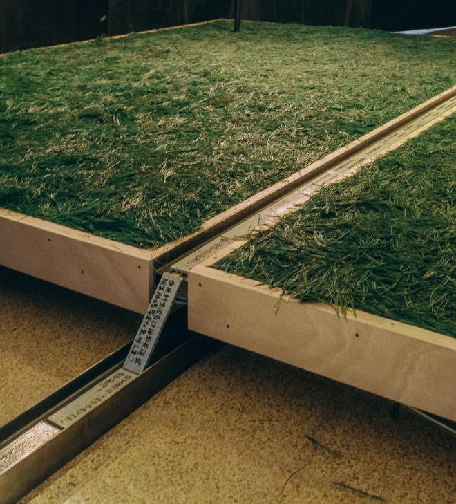 整个展览空间被一条“问题的河流”贯穿。“问题的河流”从工作桌开始穿过一个“辩经台”,最终流向远方。“辩经台”的上方是芭蕉叶,这有着“园居生活,蕉下对弈”的隐喻。“辩经台”的地面被天然松针铺满,如松针铺地的古寺。芭蕉叶和松针随着时间变化,这给整个展览空间带来退化的时间性。这个“辩经台”引导人们席地而坐,讨论问题。这里也可以成为剧场的舞台。“河流”两侧的显示屏展示着两家事务所的项目介绍。