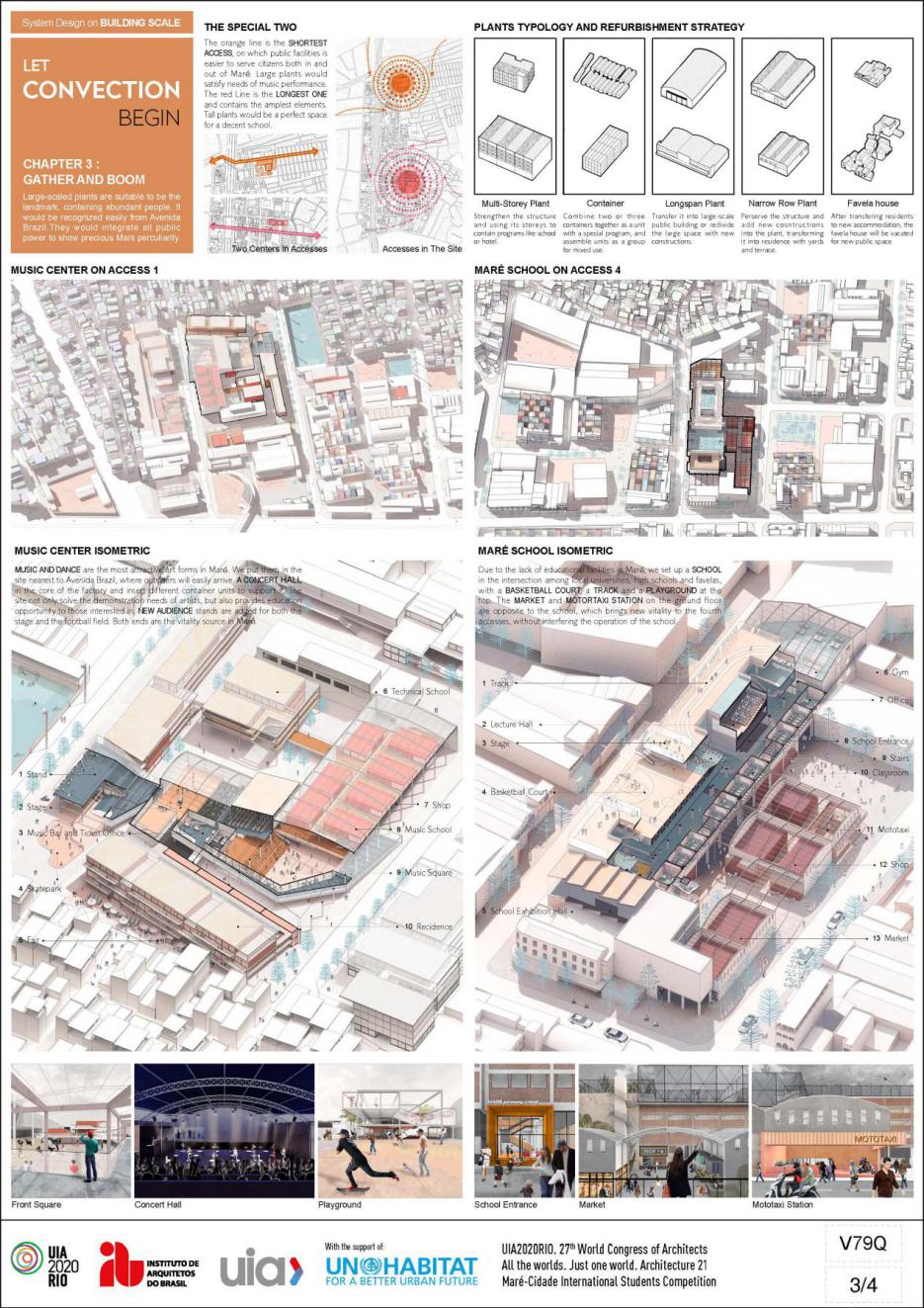 地块位于巴西里约热内卢的马里(Maré),在这里,一些在市中心已经消失的独特创造力和活力仍然繁荣(街头桑巴舞,实验性说唱音乐和民间比赛等)。设计希望可以通过在逐渐衰落的工业区中提供某些设施,让人们来体验并传播Maré的文化,促进城市和贫民窟之间的经济和文化交流,并将其形容为“对流”。在城市尺度上,设计提出使用五条轴线来连接贫民窟、基地及其周边,并在这些轴线中选择了部分关键节点,将工厂改造成文化和教育地标,以激活与城市的对流。在区域和建筑尺度上,设计根据建筑状况,将其分为三大类,据此提出了不同的策略,以在教育、交通、公共空间和住房方面提高Maré的环境和建筑空间质量。