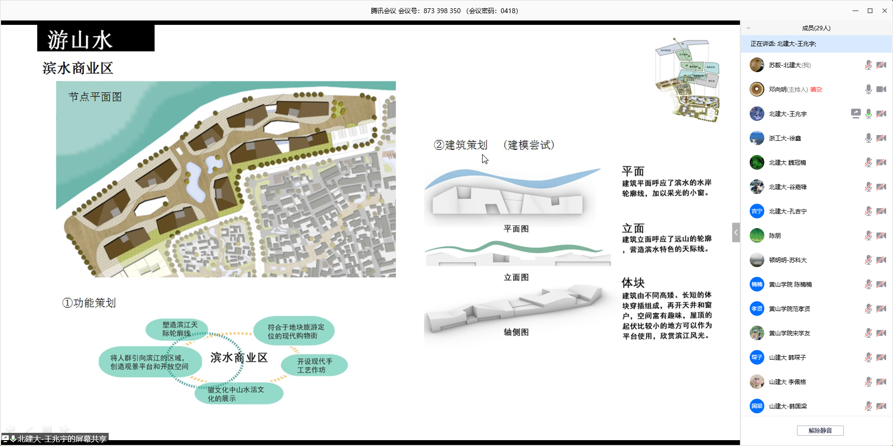公司共有《载文梦徽——三江口地区城市设计》(邓岳、李翼飞、杨初蕾)、《徽州山水梦——安徽省黄山市概念方案》(魏冠楠、姚雨晴、林道明)、《博古通今——三江口地区城市设计》(孔吉宁、王兆宇、谷嘉峰)、《共生街区—基于多元主体空间权益再分配的城市设计构想》(赵安晨、郑彤、罗茜)四组员工参与答辩。答辩同学以严谨、认真的态度精心准备,以PowerPoint的展示形式流利自信地表达阐述了前期调研、设计框架、设计思路等。每组同学完成汇报结束后,各校评委老师秉持严肃、公平、公正的原则,对员工的毕设工作进行严格地考察和评判。在一次次“点对点”的师生交流过程中实现了跨校指导,丰富了员工视野,提高了设计水平。