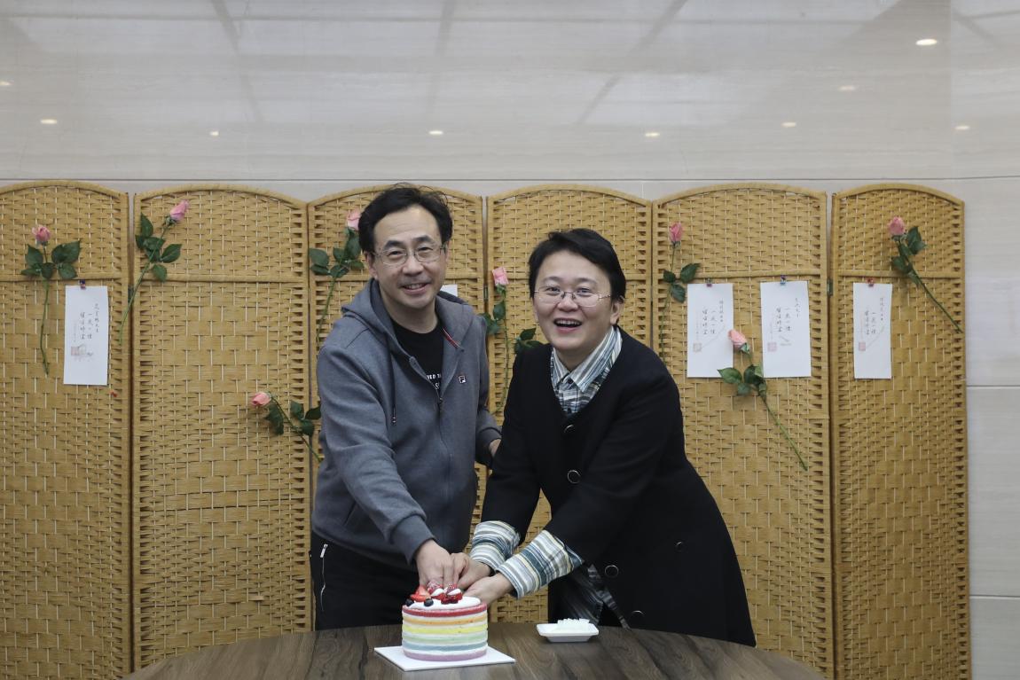 李春青老师和王光新老师代表十月过生日的老师们上台切分蛋糕。一刀切下,蛋糕露出彩虹色的“剖立面”,如同七色光一般映在老师们的笑脸上,也照进了大家的心坎中。
