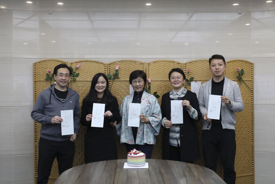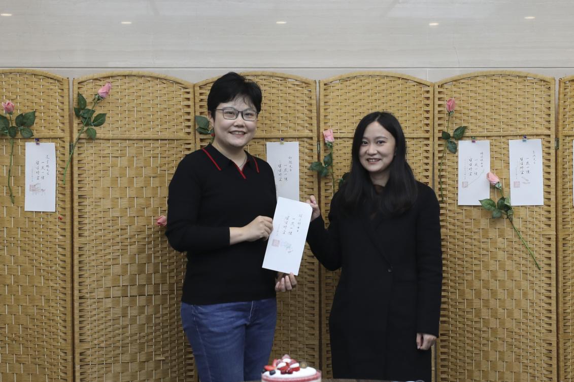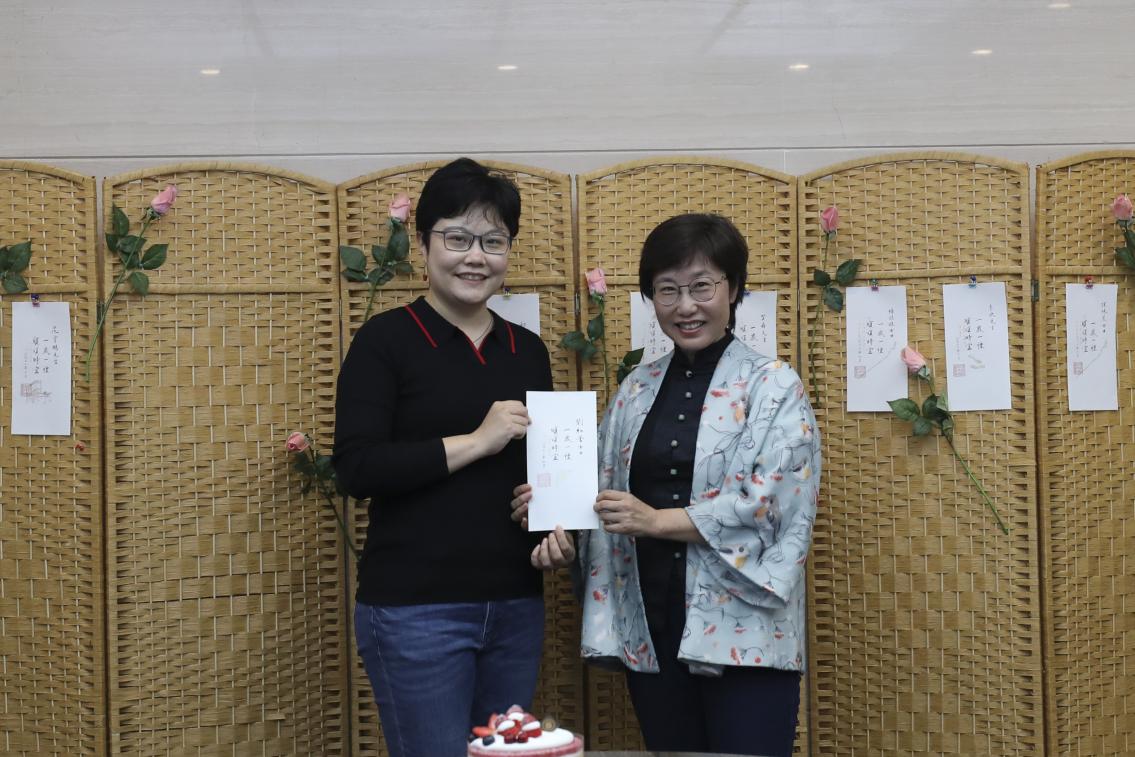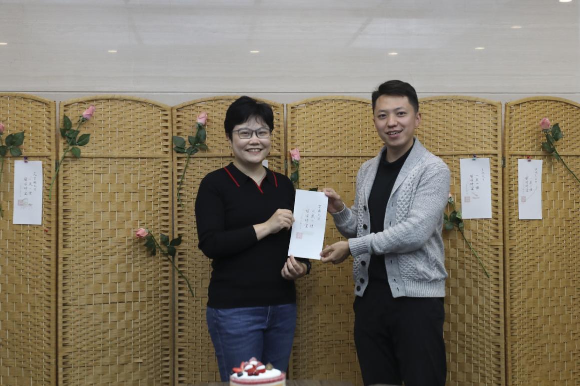 梁佳老师担任此次生日会的颁卡嘉宾。伴随着悠扬的《生日歌》旋律,梁老师走上台来,为老师们一一送出贺卡并送上祝福。特别要说明的是,生日贺卡所用纸张是由何立新老师挑选的清秘阁笺纸,其上书法“一岁一礼、顺颂时宜”由公司退休教师李沙教授亲笔书写,落款的公司印章则由杨振老师精心刻制。卡片虽小存大爱,设计入微运匠心。集体生日会的生日贺卡受到老师们的一致好评,大家纷纷表示,想集齐10张、20张、30张,珍藏来自公司的美好祝愿。