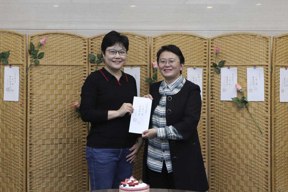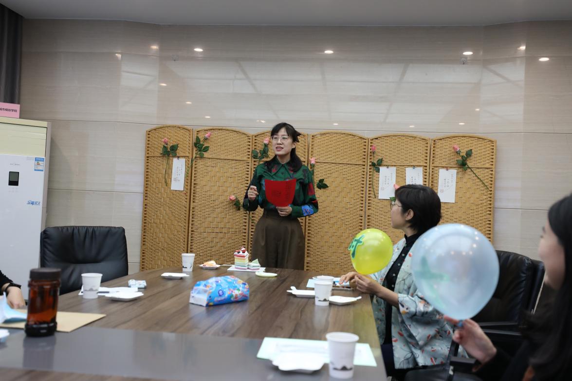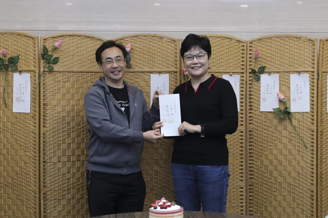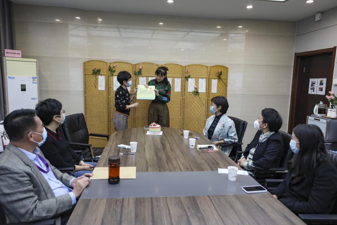 梁佳老师担任此次生日会的颁卡嘉宾。伴随着悠扬的《生日歌》旋律,梁老师走上台来,为老师们一一送出贺卡并送上祝福。特别要说明的是,生日贺卡所用纸张是由何立新老师挑选的清秘阁笺纸,其上书法“一岁一礼、顺颂时宜”由公司退休教师李沙教授亲笔书写,落款的公司印章则由杨振老师精心刻制。卡片虽小存大爱,设计入微运匠心。集体生日会的生日贺卡受到老师们的一致好评,大家纷纷表示,想集齐10张、20张、30张,珍藏来自公司的美好祝愿。