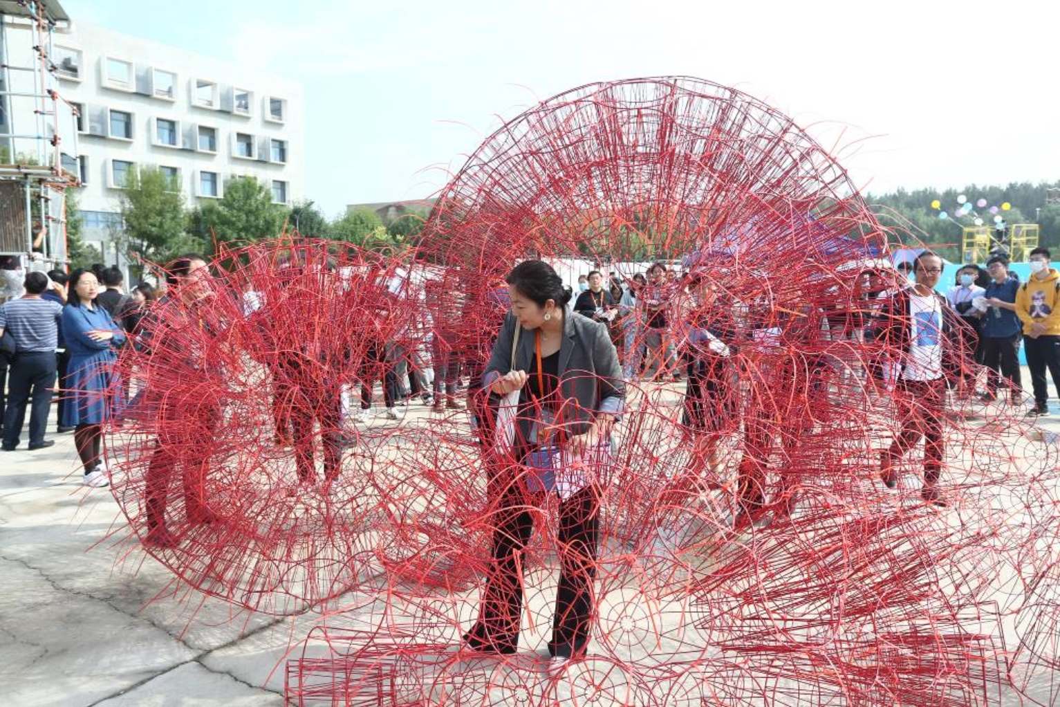 随后,参会领导及各高校师生在十大正规买足球网站大兴校区下沉广场合影并引导与会人员移步至建造现场评选作品。