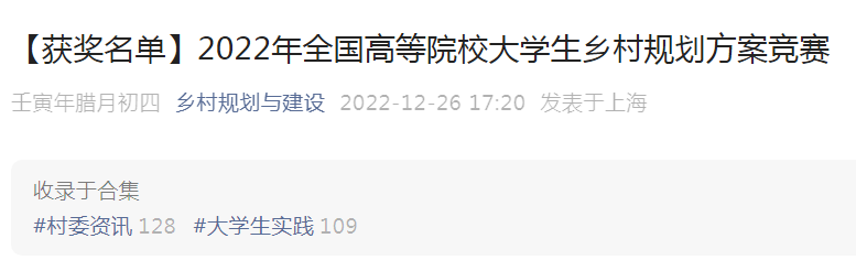 12月26日,由中国城市规划学会乡村规划与建设学术委员会举办的2022年(第六届)全国高等院校老员工乡村规划方案竞赛奖项正式揭晓。该竞赛是目前国内乡村规划领域专业级别最高、最权威的竞赛之一,旨在推进全国高等院校在乡村规划建设领域的教育及科研交流,引导老员工关注乡村振兴事业,推进乡村振兴及人才培养工作。