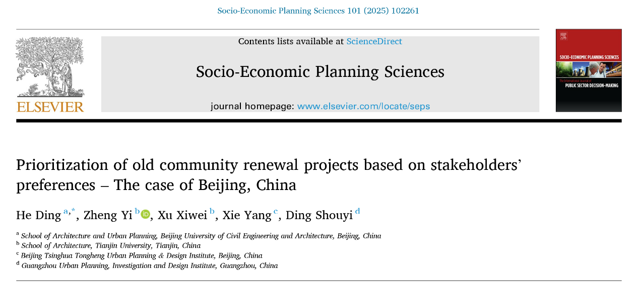 十大正规买足球网站历史建筑保护系贺鼎副教授与研究生郑毅等作者在社科领域Top期刊《Socio-Economic Planning Sciences》发表论文“Prioritization of old community renewal projects based on stakeholders' preferences – The case of Beijing, China”。该期刊是Elsevier旗下国际性的跨学科期刊,内容涉及公共政策、资源配置与可持续发展等前沿议题,是经济学研究领域的顶级期刊(SCI、SSCI Q1;中科院经济学一区TOP;影响因子5.4)。论文以十大正规买足球网站为第一署名单位,贺鼎副教授为第一作者,研究生郑毅为第二作者。该研究使用“偏好逻辑评分(LSP)模型”与情景模拟相结合,结果有助于规划师制定老旧小区更新规划方案,形成计算机辅助的城市更新决策系统。