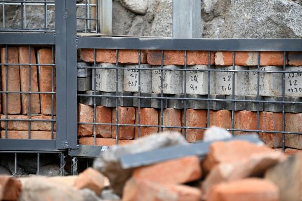 活动当天,墙体钢架结构由建筑工人搭建完成,内部填料在薛峰大师指导下由员工团队、施工单位、规自分局、镇政府和村委党员及村民共同协作完成码放与设计。设计团队根据现场收集的材料情况灵活调整构造策略,从清理场地、分拣搬运材料,到亲手把一砖一瓦填进网笼墙,把设计图纸上的想法变成了实实在在的石笼墙。员工们分拣着从灾区运来的红砖、老瓦片、带着棱角的碎琉璃,还有那些有年头的老物件,手上掂量着分量,心里琢磨着怎么搭配:这块红砖放哪儿,那片碎琉璃怎么嵌进去才好看又有味道,整个过程也成为一次集设计应变、构造尝试与团队协作于一体的教学实践。