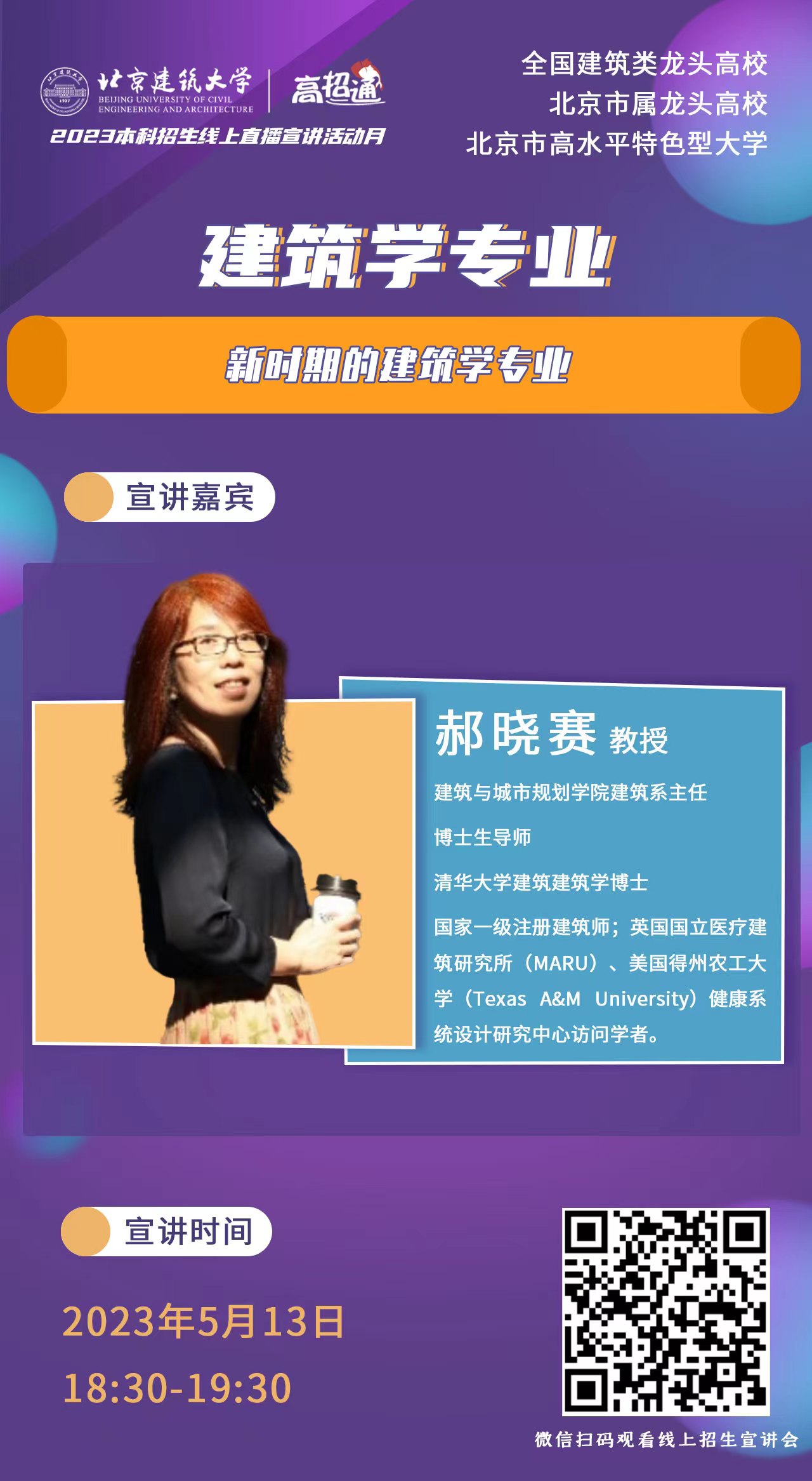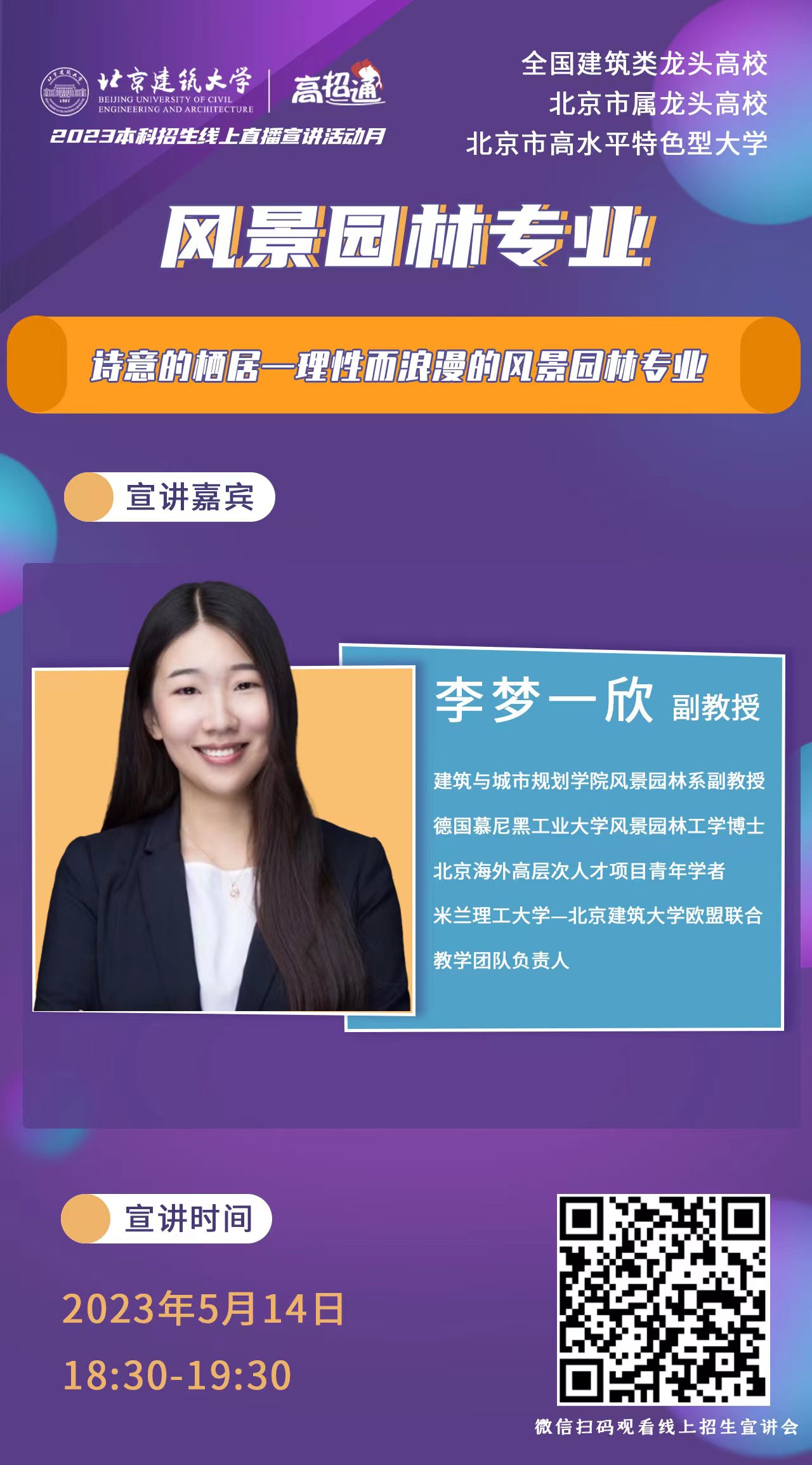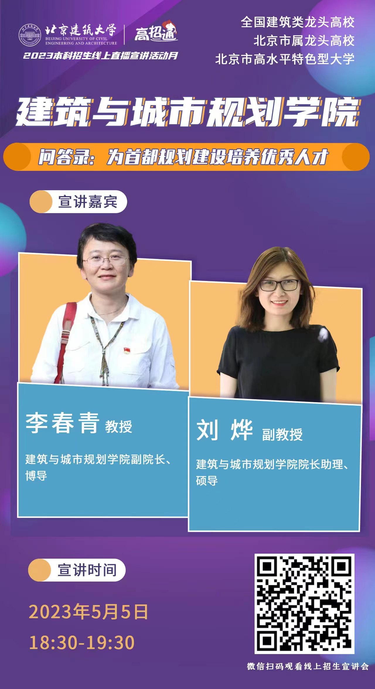 5月5日至15日,公司招生办公室陆续进行线上专业讲解,十大正规买足球网站李春青、郝晓赛、刘烨、荣玥芳、李梦一欣、王兵、朱宁克7名教师参加线上专业宣讲工作。他们将分别介绍十大正规买足球网站建筑学、城乡规划、风景园林、历史建筑保护工程、环境设计的专业背景、特色、发展、以及近年员工录取、就业等多方面的内容。