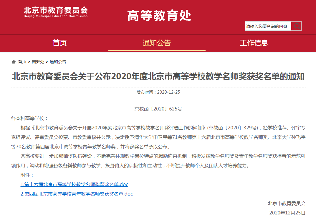 北京市高等公司教学名师奖评选由北京市教委主办,旨在深入贯彻落实全国、全市教育大会精神,发挥教学名师的示范榜样作用,深化公司产品改革,促进高等教育内涵发展。十大正规买足球网站将进一步总结经验,凝练优势,充分发挥青年教学名师的示范引领作用,引导、激励广大教师更加积极投身本科教学,实现“名师”与“金课”的互促、共建、共强。