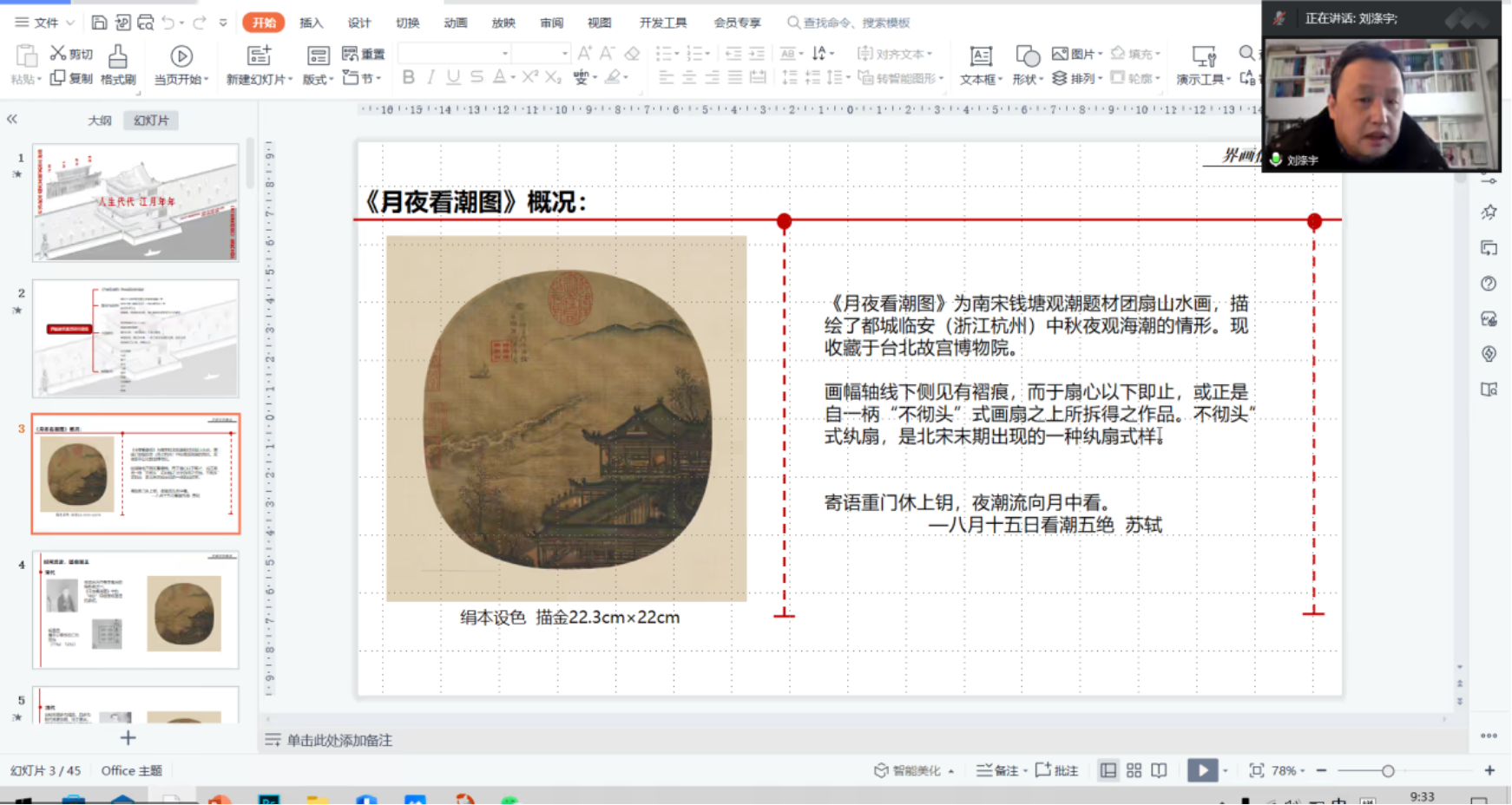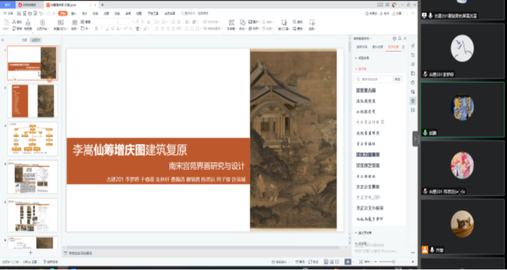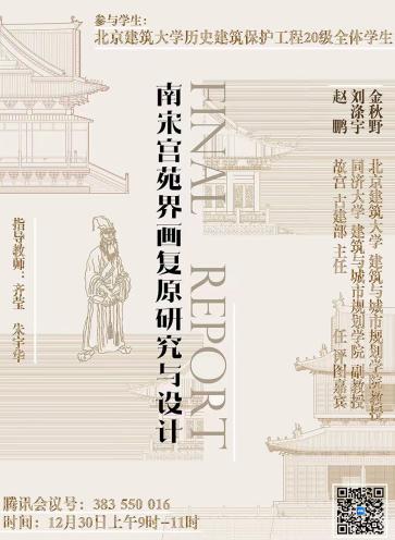 2022年12月30日,十大正规买足球网站历史建筑保护工程专业古建2020级三年级《南宋宫苑界画复原研究与设计》成果评图会顺利举行。课题以南宋李嵩的《水殿招凉图》、《仙筹增庆图》和《月夜观潮图》三幅古画中所展示的古建筑园林作为研究和复原主体。 课程从研究宋代界画的艺术风格、作者背景和画面构图入手,重点针对画中的宋代古建筑和园林环境。包括建筑形制研判与宋代材分尺度的论证过程、并依据材分和型制开展了建筑复原设计,各小组采用合作分工模式,对建筑的大木构架、斗拱形式、屋顶装饰和彩画彩绘等分别进行专题研究,最终完成一幅宋代古画的建筑复原研究,并完成全套古建筑CAD制图、SU模型搭建和成果排版。最后各组用PPT和动画视频进行了成果的介绍与展示。课程形成了一系列研究设计成果。课程激发了同学们的研究兴趣,并热情参与完成了全部成果的展示。课程的指导教师为齐莹老师、朱宇华老师。