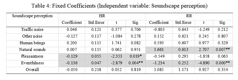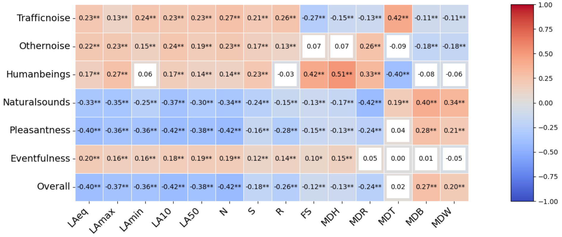 研究团队基于实验室实验,通过实地测量、量表评估、实证研究和数据统计分析的方式,在半消声实验室条件下,重现TODs区域的声环境,探究在TODs区域声环境中,物理声学指标、心理声学指标和声源掩蔽指标,对于声景主观感知和生理指标变化的影响,并以声景总体质量为因变量,建立广义线性混合模型,以预测TODs区域声景总体质量,最后进一步分析TODs和TADs在声学指标、声景感知和生理指标变化之间的差异性,研究表明:①与公园、城市广场等区域不同,在TODs等城市高密度区域中,人类活动声音,会显著降低TODs区域声景总体质量,同时研究表明,在TODs区域中,交通声音与声景总体质量并不存在显著相关性。②个体在短时间声环境刺激(1分钟)下,心率(HR)上升、心率变异性(HRV)下降、皮肤电反应(SCL)增强,体现出明显的应激生理反应,尤其女性的反应更为敏感。③声学指标不仅显著影响声景感知,还会激发不同的生理反应。更高的响度和交通声掩蔽时间会导致更强的生理压力。此外,声源类型的掩蔽时间也影响生理表现,自然声出现时间越长,个体生理状态越稳定。④建立了基于广义线性混合模型(GLMM)的声景总体质量预测模型。预测准确率达到74.4%。该模型能有效解释TODs区域声环境中主观感知与客观指标的复杂交互关系,为城市声环境优化提供了数据支持。⑤通过对比了TODs与TADs两类城市空间在声环境与人体反应上的差异发现,TODs区域在声压水平、响度等方面均高于TADs,声景愉悦性和总体质量感知显著较低,且引发更剧烈的生理应激反应。
