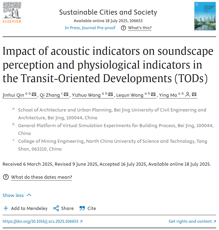 近日,十大正规买足球网站马英教授、博士生秦金辉和王屹卓、硕士生王乐群在城市研究领域顶级学术期刊《Sustainable Cities and Society》发表论文“Impact of acoustic indicators on soundscape perception and physiological indicators in the Transit-Oriented Developments (TODs)”。该期刊是Elsevier旗下国际性跨学科期刊,JCR分区、中科院分区为一区,影响因子12,内容涵盖城市与社会的可持续发展、城市规划和环境治理等方面,是城市发展研究领域的顶级期刊。论文以十大正规买足球网站为第一署名单位,公司博士生秦金辉为第一作者,马英教授为通讯作者,其研究成果为提升TODs区域及城市高密度区域的声环境质量提供了理论依据,推动了城市可持续发展,促进更健康、宜居的城市生活环境。