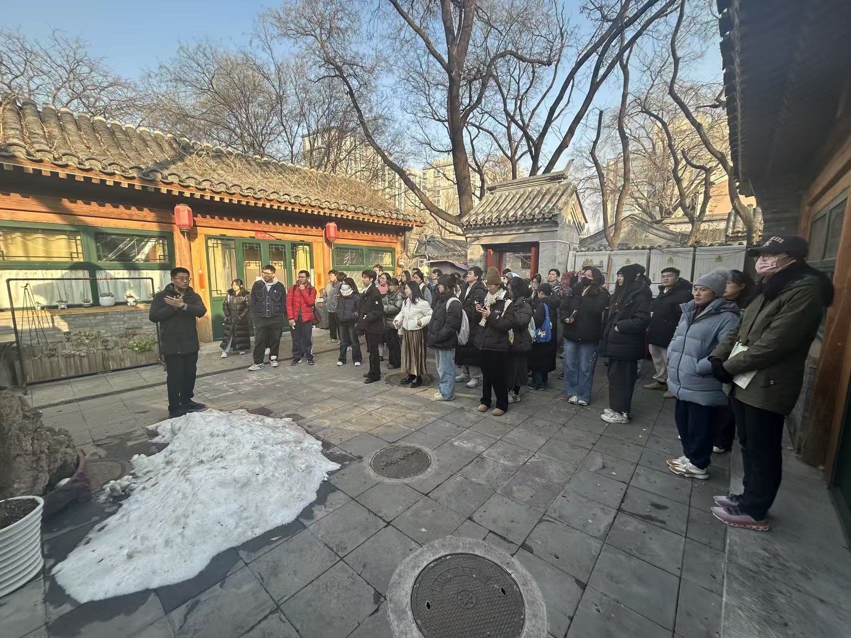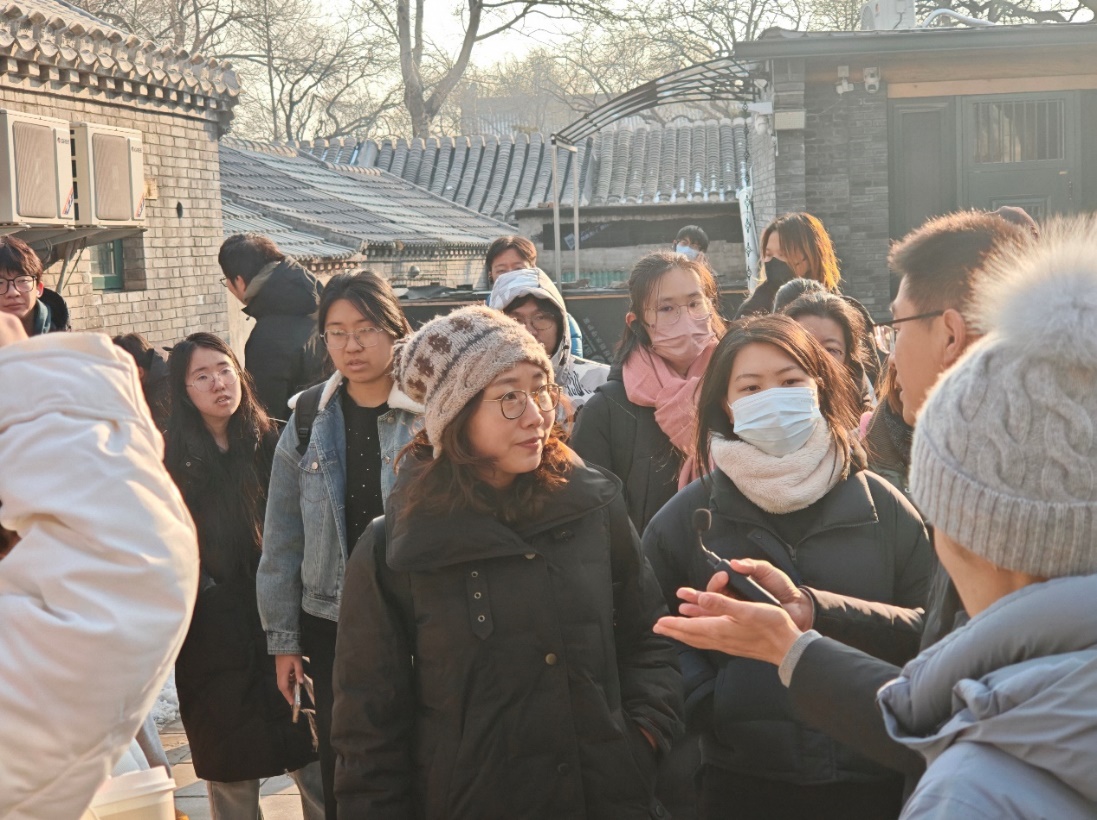 在调研过程中同学们深入西砖胡同进行实地踏勘,边走边看、边听边问,用脚步丈量街巷尺度,用镜头与笔触记录下传统风貌、院落空间、公共环境以及充满烟火气的生活场景。在已实施更新的共生院内,金恒丰公司项目负责人进行现场教学,详细讲解了从“申请式退租”到“适应性利用”的实际运作过程、技术难点以及后续可持续运营面临的挑战,让大家深刻体悟到,老城更新不仅是一项物质空间改造,更是一场精细的社会治理与长效的文化保育,必须多专业协同发力。