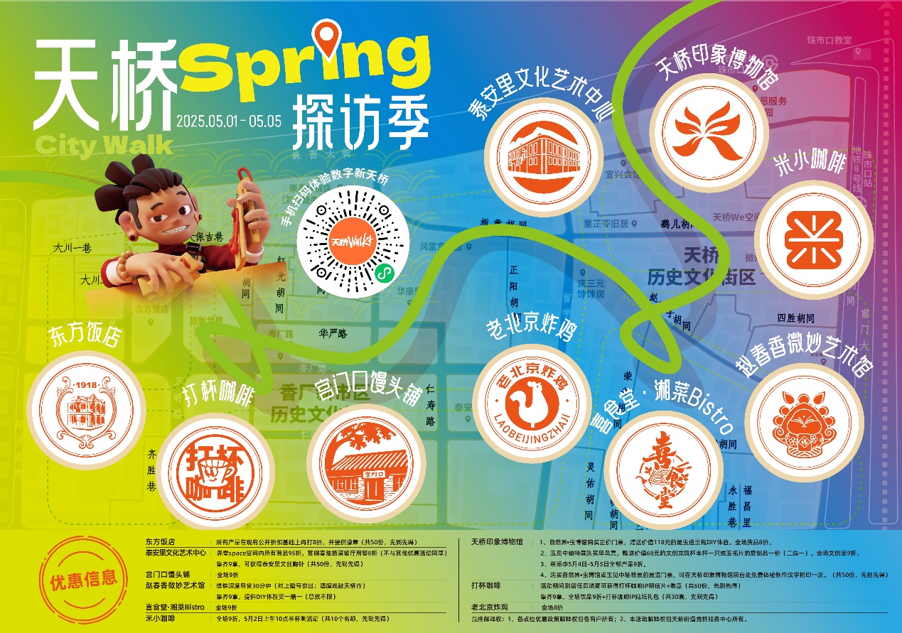 同步启动的“天桥Spring探访季”活动,包括“串门打卡”特色点位五一优惠活动和“天桥Citywalk剧本杀”沉浸体验两个部分。“五一”期间(5月1日-5月5日)领取特制探访地图打卡宫门口馒头、泰安里艺术中心等9处特色点位,可获得优惠或限量文创礼品,进一步激活遗产地消费与文化参与。