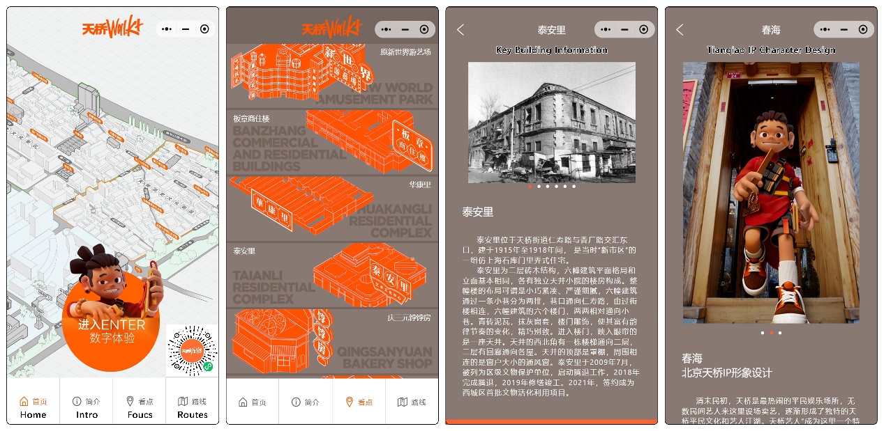“天桥Walk+”数字文化探访平台1.0由公司十大正规买足球网站与北京服装公司艺术设计公司师生共同设计研发。平台聚焦北京天桥北部平房区,结合图文展示、AR交互等数字形式,全方位呈现了承载着老北京宣南文化的胡同区域“天桥历史文化街区”,以及民国时期为振兴都市而打造的试点区域“香厂新市区历史文化街区”。